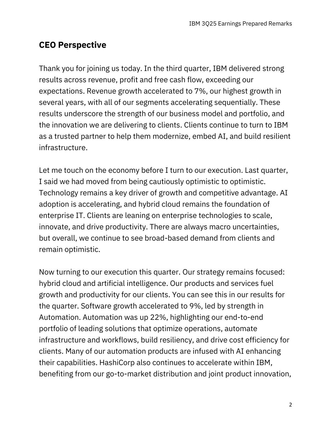 IBM 3Q25收益准备备注2 CEO视角感谢您今天加入我们。第三季度,IBM在收入、利润和自由现金流方面都取得了强劲的业绩,超出了我们的预期。收入增长加速至7%,这是我们几年来的最高增长,我们所有的细分领域都在环比加速。这些结果凸显了我们的商业模式和投资组合的实力,以及我们正在为客户提供的创新。客户继续将IBM视为值得信赖的合作伙伴,以帮助他们实现现代化、嵌入人工智能并构建具有弹性的基础设施。在我谈到我们的执行之前,让我先谈谈经济。上个季度,我说我们已经从谨慎乐观转向乐观。技术仍然是增长和竞争优势的关键驱动力。人工智能的采用正在加速,混合云仍然是企业IT的基础。客户正在依靠企业技术来扩展、创新并推动生产力。宏观不确定性始终存在,但总体而言,我们继续看到客户的广泛需求,并保持乐观。现在转向我们本季度的执行。我们的战略仍然是重点:混合云和人工智能。我们的产品和服务推动了客户的增长和生产力。你可以在我们本季度的业绩中看到这一点。软件增速加快至9%,自动化走强引领。自动化增长22%,突显了我们的端到端领先解决方案组合,这些解决方案可优化运营、自动化基础设施和工作流程、构建弹性并为客户提高成本效率。我们的许多自动化产品都注入了AI,增强了它们的能力。HashiCorp在IBM内部也在继续加速,受益于我们的上市分销和联合产品创新,