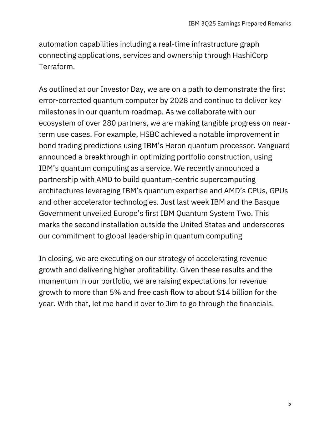 IBM 3Q25 Earnings Prepared Remarks 5 automation capabilities,including a real-time infrastructure graph connecting applications,services and ownership through HashiCorp Terraform。正如我们在投资者日上所概述的那样,我们正走在一条到2028年展示第一台纠错量子计算机的道路上,并继续在我们的量子路线图中实现关键的里程碑。随着我们与超过280个合作伙伴的生态系统合作,我们正在近期用例方面取得切实进展。例如,汇丰银行使用IBM的Heron量子处理器在债券交易预测方面实现了显着改进。Vanguard宣布在优化组合构建方面取得突破,使用IBM的量子计算即服务。我们最近宣布与AMD建立合作伙伴关系,利用IBM的量子专业知识以及AMD的CPU、GPU和其他加速器技术,构建以量子为中心的超级计算架构。就在上周,IBM与巴斯克政府推出了欧洲首个IBM量子系统二。这标志着美国以外的第二次安装,并强调了我们对量子计算全球领导地位的承诺。最后,我们正在执行加速收入增长和提供更高盈利能力的战略。鉴于这些结果和我们投资组合的势头,我们将今年的收入增长预期提高到5%以上,自由现金流提高到140亿美元左右。有了这个,让我把它交给吉姆去查财务。