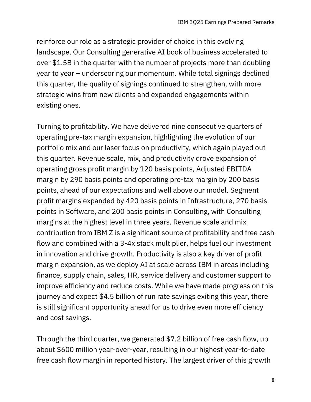 IBM 2015年第三季度收益准备好的评论8加强了我们作为这一不断变化的环境中的首选战略提供商的作用。我们的咨询生成AI业务手册在本季度加速至超过1.5B美元,项目数量同比增长超过一倍——突显了我们的势头。虽然本季度总签约量有所下降,但签约质量继续加强,新客户获得了更多战略性胜利,现有客户内部的参与度也有所扩大。转向盈利。我们已经实现了连续九个季度的经营税前利润率扩张,这突出了我们投资组合组合的演变以及我们对生产力的高度关注,这在本季度再次发挥了作用。收入规模、组合和生产力推动经营毛利率扩大120个基点,调整后EBITDA利润率扩大290个基点,经营税前利润率扩大200个基点,超出我们的预期,远高于我们的模型。分部利润率在基础设施领域扩大420个基点,在软件领域扩大270个基点,在咨询领域扩大200个基点,咨询利润率处于三年来的最高水平。来自IBM Z的收入规模和组合贡献是盈利能力和自由现金流的重要来源,再加上3-4倍的堆栈乘数,有助于推动我们对创新的投资并推动增长。生产力也是利润率扩张的关键驱动力,因为我们在财务、供应链、销售、人力资源、服务交付和客户支持等领域在IBM大规模部署人工智能,以提高效率并降低成本。尽管我们在这一旅程中取得了进展,并预计今年将节省45亿美元的运行率,但我们仍然有很大的机会推动更多的效率和成本节约。截至第三季度,我们产生了72亿美元的自由现金流,同比增长约6亿美元,创造了报告历史上迄今为止最高的自由现金流利润率。这一增长的最大驱动力