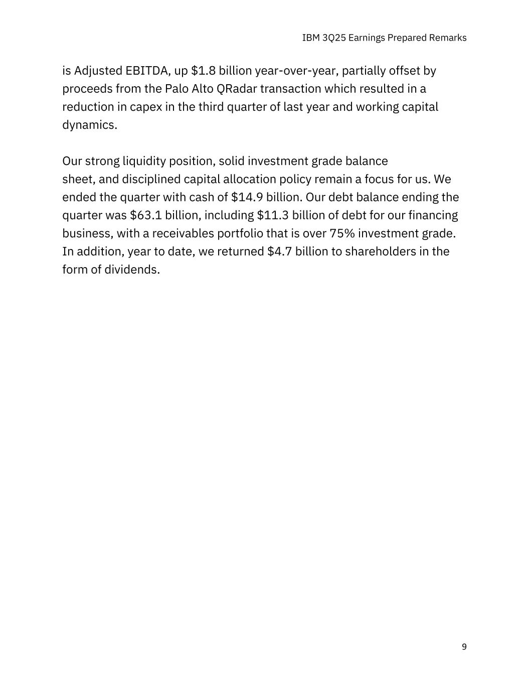 IBM 2015年第三季度收益编制备注9是调整后EBITDA,同比增长18亿美元,部分被Palo Alto QRadar交易的收益所抵消,该交易导致去年第三季度的资本支出减少,以及营运资本动态。我们强大的流动性头寸、稳健的投资级资产负债表以及纪律严明的资本配置政策仍然是我们关注的重点。我们在本季度末的现金为149亿美元。截至本季度末,我们的债务余额为631亿美元,其中包括113亿美元的融资业务债务,应收账款组合的投资级别超过75%。此外,年初至今,我们以股息的形式向股东返还了47亿美元。