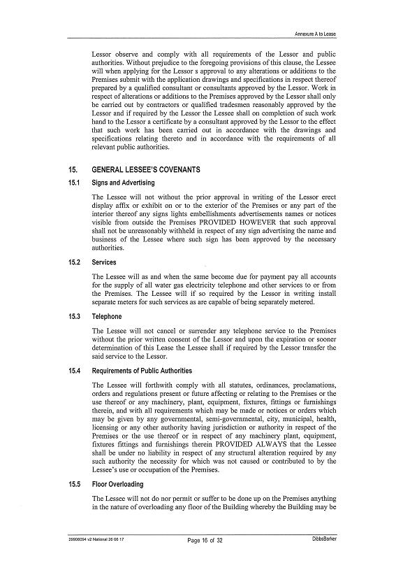 租赁出租人遵守并遵守出租人和公共当局的所有要求。在不影响本条款前述规定的情况下,承租人在申请出租人批准对房屋的任何改动或增建时,将提交由出租人批准的合格顾问或顾问准备的申请图纸和规格。出租人批准的与房屋改建或增建有关的工作只能由出租人合理批准的承包商或合格商人进行,并且如果出租人要求,承租人应在完成此类工作后向出租人提供一份由出租人批准的顾问出具的证明此类工作已根据与其相关的图纸和规范以及所有相关公共当局的要求进行。15.Genera l Lessee的契约1。标志未经出租人事先书面批准,承租人不得在房屋外部或其内部任何部分竖立展示贴或附件任何标志灯点缀广告名称或从场所外可见的通知,但对于任何宣传承租人名称和业务的标志,如果该标志已获得必要当局的批准,则不得无理拒绝此类批准。2.服务承租人将在付款到期时支付所有账户,以供应所有进出场所的水、气、电电话和其他服务。如果出租人以书面形式要求,承租人将为能够单独计量的服务安装单独的仪表。3.未经出租人事先书面同意,承租人不得取消或放弃任何电话服务,并且在本租约到期或提前确定时,如果出租人要求,承租人应将上述服务转让给出租人。4.公共当局的要求承租人将立即遵守当前或未来影响或与场所或其使用或其中的任何机械、厂房、设备、固定装置、配件或家具有关的所有法令、条例、公告、命令和法规,以及任何政府、半政府、城市、市政、卫生、许可或任何其他对处所或其使用或任何机械装置、设备具有管辖权或权力的当局,其中的固定装置和家具始终规定,承租人对任何此类当局要求的任何结构改动不承担任何责任,这些改动的必要性不是由承租人使用或占用房屋引起或促成的。5.FLOO R超载承租人不会也不允许或忍受在房屋内进行任何具有超载建筑物任何楼层性质的事情,而该建筑物可能是Dibbsbarker 29906094 v2 National 260617第16页,共32页