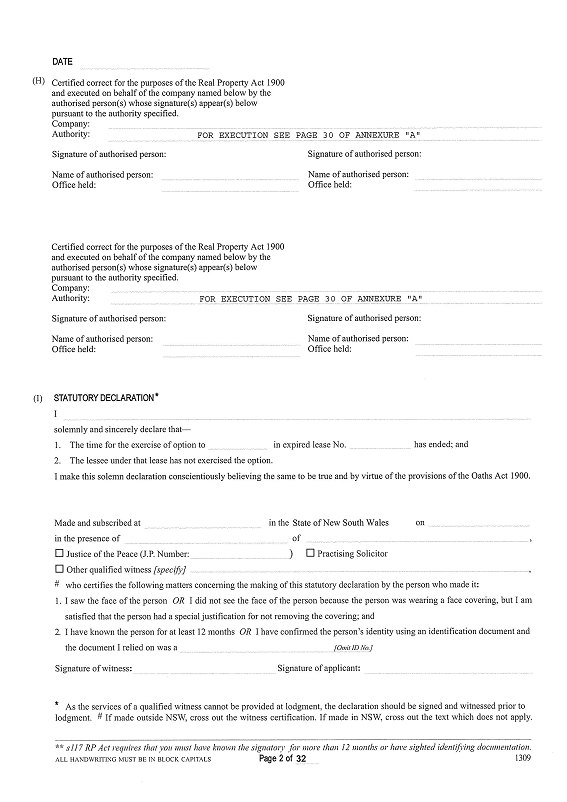 日期(h)为1900年《不动产法》的目的证明正确,并由其签名出现在下方的授权人根据指定的权限代表以下指定的公司签署。公司:授权:执行见授权人签名:附件第30页“A”被授权人姓名:任职:被授权人签名:被授权人姓名:任职:就《不动产法》而言,经认证正确1900并由其签名出现在下方的授权人根据指定的权限代表以下指定的公司签署。公司:授权:执行见授权人签名:附件第30页“A”被授权人姓名:任职:被授权人签名:被授权人姓名:任职:(i)法定人Y声明*到期租约编号庄严真诚地声明-1。行使选择权的时间为2。该租约下的承租人未行使选择权。已经结束;并且我根据1900年《誓言法》的规定,做出这一庄严声明,并认真地相信这是真实的。在D太平绅士在场的情况下作出和签署(J.P.编号:D其他合格证人[Spec[FY]#谁负责与作出本法定声明的人作出本法定声明有关的以下事项:1。我看到了那个人的脸,或者我没有看到那个人的脸,因为那个人戴着口罩,但我相信这个人有特殊的理由不拆掉口罩;和2。我已认识该人至少12个月或已使用身份证明文件确认该人的身份在新南威尔士州)d我所依赖的文件的执业律师是[OMI身份证号]证人签名:申请人签名:*因为不能在提交时提供合格证人的服务,该声明应在提交前签署并见证。#如果在新南威尔士州以外制作,请划掉证人证明。如果在新南威尔士州制作,则划掉不适用的文本。S 117 RP法案要求您必须已了解SIG11AT01Y超过12个月或已通过文档11ME11TATIO11识别身份。所有笔迹必须用大写字母书写PAG E2OF321309