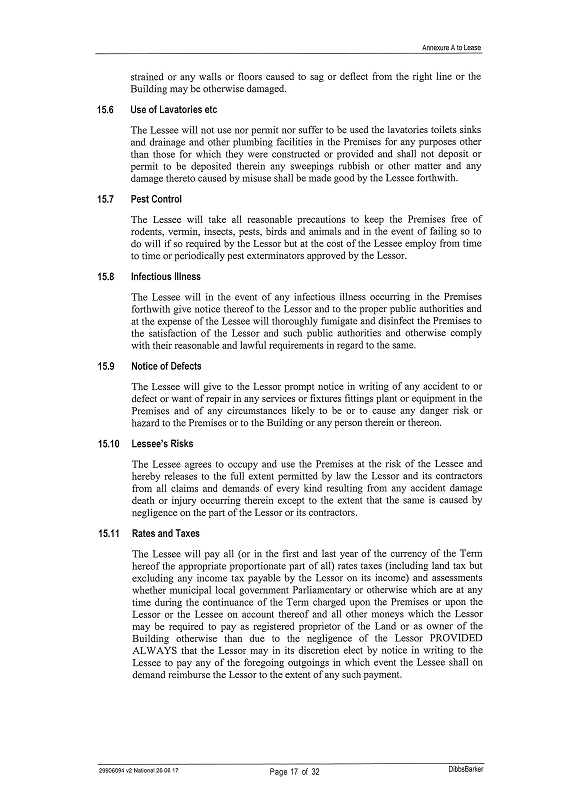 租赁附件紧张或任何墙壁或地板从右线下垂或偏转,否则建筑物可能会以其他方式损坏。6.US e o f lavatorie s等承租人不得使用、允许或容忍使用场所内的盥洗室厕所水槽和排水系统以及其他管道设施用于建造或提供的目的以外的任何目的并且不得在其中存放或存放任何清扫垃圾或其他物品,并且因误用而对其造成的任何损坏应由承租人立即修复。7.PES T控制承租人将采取一切合理的预防措施,使房屋没有啮齿动物、害虫、昆虫、害虫、鸟类和动物,如果不这样做,出租人会要求这样做,但费用由承租人不时或定期雇用出租人批准的害虫除虫剂。8.如果房屋内发生任何传染病,承租人将立即通知出租人和适当的公共当局,并由承租人承担费用进行彻底熏蒸并对房屋进行消毒,使出租人和此类公共当局满意,并以其他方式遵守其合理合法的要求。9.通知或缺陷承租人将立即以书面形式通知出租人任何服务或固定装置的任何事故或缺陷或需要维修的场所内的配件工厂或设备以及可能对处所或建筑物或其中或其上的任何人造成或导致任何危险风险或危害的任何情况。10.承租人的风险承租人同意由承租人承担风险占用和使用房屋,并特此在法律允许的最大范围内免除出租人及其承包商的所有索赔以及因在其中发生的任何事故损害死亡或伤害而导致的各种要求,除非该要求是由出租人或其承包商的疏忽造成的。11.税率和税款承租人将支付所有(或在本协议期限的货币的第一年和最后一年支付所有适当比例的部分)税率税(包括土地税,但不包括出租人就其收入应付的任何所得税)和评估,无论是市政地方政府议会还是其他方式,在期限持续期间的任何时间对房屋或出租人或承租人收取费用以及出租人作为土地的注册所有人或建筑物的所有者可能需要支付的所有其他款项,除非由于出租人的疏忽,始终提供出租人可自行决定以书面通知承租人的方式选择支付上述任何支出,在这种情况下,承租人应根据要求在任何此类付款的范围内偿还出租人。Dibbsbarker 29906094 v2 National 260617第17页,共32页