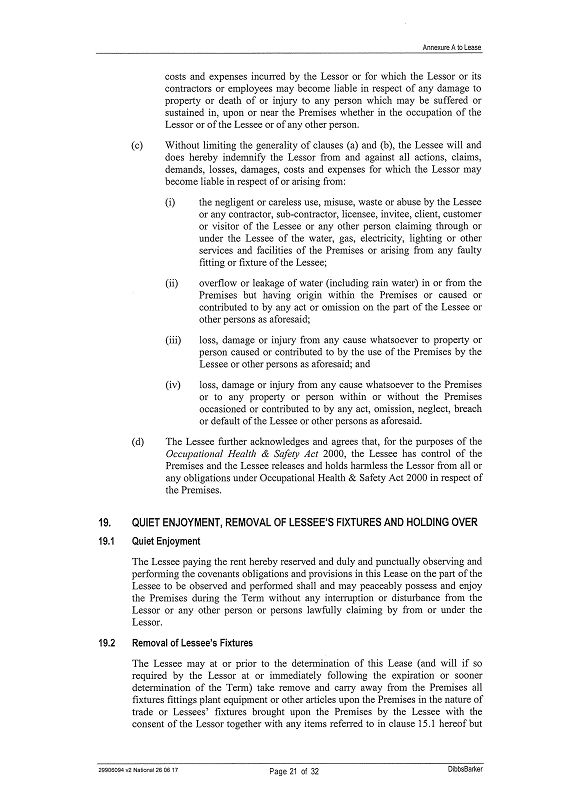 出租人发生的租赁成本和费用,或出租人或其承包商或雇员可能因财产损失或任何人的死亡或伤害而承担的责任,这些损失和费用可能在以下情况下遭受或承受,在房屋内或附近,无论是在出租人或承租人或任何其他人的占用中。Dibbsbarker 29906094 v2 National 260617 Page 21 of 32(c)在不限制(a)和(b)条的一般性的情况下,承租人将并确实在此赔偿出租人免受所有诉讼、索赔、要求、损失,损害赔偿,出租人可能因以下原因承担责任的成本和费用:(i)承租人或任何承包商、分包商、被许可人、受邀人、客户的疏忽或粗心使用、误用、浪费或滥用,承租人的客户或访客或通过承租人或在承租人之下对水、气、电、照明或其他服务处所的设施或由承租人的任何有缺陷的配件或固定装置引起的;水(包括雨水)在处所内或从处所溢出或泄漏,但起源于处所内或由任何行为引起或促成或上述承租人或其他人的遗漏;损失,因承租人或上述其他人使用场所而对财产或人员造成或促成的任何原因造成的损害或伤害;损失,因承租人或上述其他人的任何作为、不作为、疏忽、违约或违约而引起或促成的任何原因对房屋或房屋内或房屋外的任何财产或人员造成的损害或伤害。(d)承租人进一步承认并同意,就2000年职业健康与安全法而言,承租人对房屋拥有控制权,并且承租人免除出租人根据2000年职业健康与安全法对房屋承担的所有或任何义务,并使出租人免受损害。19.quie t enjection,remova lof LESSEE的固定装置和固定装置超过1。承租人支付特此保留的租金,并及时、准时地遵守和履行本租约中承租人应遵守和履行的契约义务和规定,应并且可以和平地拥有并在期限内享受房屋,而不会受到出租人或任何其他人或由出租人或在出租人之下合法索赔的人的任何干扰或干扰。2.承租人可以在确定本租约时或之前移除承租人的固定装置(并将如果出租人在期限届满或更早确定期限时或紧随其后提出要求)采取移除并将所有固定装置配件、工厂设备或其他具有贸易性质的物品或承租人在出租人同意的情况下带入房地的承租人固定装置连同第15条中提及的任何物品一起运出房地。1其中但是