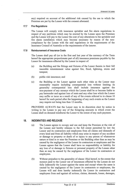 附件E A T O租赁任何),因为承租人在上述同意的情况下使用房屋会造成额外风险。7.承租人将遵守有关承租人可能在房屋内竖立的任何隔板的保险喷水灭火和火灾警报规定,并且承租人将向出租人支付对喷水灭火装置进行任何改动的费用由于承租人不遵守上述规定或澳大利亚保险委员会的要求或保险人的要求而可能需要安装火警装置。8.承租人应支付全部(或在第一和本协议期限的最后一年所有)保险费的适当比例部分)出租人为出租人投保的保险费:Dibbsbarker 29906094 v2 National 260617 Page 20 of 32(a)建筑物以及出租人在其中的配件和固定装置的全部可保恢复价值,以防止火灾、洪水、闪电、暴风雨;公共风险保险;和建筑物或出租人针对出租人可能合理要求的其他风险,包括间接损失但不限制其一般性后果性损失应包括针对不支付承租人应或将有责任支付的任何款项的保险并防止租金损失出租人可能因本协议第10条中提及的任何事件而遭受或招致的任何其他损失,在出租人可能要求的任何此类事件发生后不少于12个月的期间内,(b)(c)始终规定,出租人可以自行决定以书面通知承租人的方式选择支付上述任何款项,在这种情况下,承租人应根据要求在任何此类付款的范围内偿还出租人。18 .赔偿和免责声明(a)承租人同意占用、使用和保持房屋的风险由承租人承担,并特此在法律允许的最大范围内免除出租人及其承包商和雇员的所有索赔和各种要求以及因任何性质或种类的任何人在处所或建筑物内或附近发生的任何事故或财产损坏或死亡或受伤而可能产生的所有责任,但不包括可能是由于出租人、其承包商或雇员的疏忽造成的,并且承租人同意出租人对承租人的固定装置或个人财产的任何损失或损坏不承担任何责任或义务,除非可能由出租人的承包商或雇员的疏忽造成。在不影响第18(a)条的一般性的情况下,如果从承租人投保的保险中支付给出租人的款项不能完全补偿出租人,除非同样的情况是由于出租人的承包商或雇员的疏忽造成的,承租人将并确实在此向出租人的承包商和雇员赔偿所有诉讼、索赔、要求、损失、损害,(b)