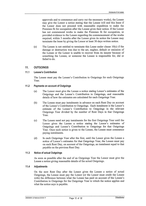 Annexur e a t o Lease Dibbsbarker 29906094 v2 National 260617第9页,共323。长期租赁本租赁自参考附表第5项规定的租赁日期开始,至参考附表第6项规定的租赁日期终止。4.不包括影响契约和权力(a)根据第84、84 a条在每项租约中隐含的契约、权力和规定,1919年《转让法案》(新南威尔士州)第85条和第86条不适用于本租约或在本租约中暗示,除非其相同或部分或部分包含在下文包含的契约中。在本租约中,以1919年《转易法》(新南威尔士州)第2部分或附表4第一列中任何形式的词语使用的词语并不暗示1919年《转易法》(新南威尔士州)第86条下的契约。(b)5。租金(a)承租人必须在每个租金日通过直接借记或出租人以其他方式指示,以每月等额分期付款的方式向出租人支付租金。(b)如分期付款的期间少于1个月,则该分期付款为租金除以365再乘以该期间的天数。6.6.1每年增加租金增加(a)租金将按照第12项规定的方式每年增加。(b)如第12项指明该日期为CPI调整日,则适用的新租金将为以下两者中的较大者:(i)紧接相关审查日期之前的应付租金乘以当前CPI,再除以之前的CPI;紧接相关审查日期之前的应付租金增加4%。(c)如果没有现行CPI,就第6.l(b)(i)条而言,承租人必须支付现有租金,直至有现行CPI。在可获得第6条中的计算信息后的第一个租金日。l(b)(i),承租人必须支付承租人因租金支付的金额与从相关审查日期(包括该日期)到但不包括该租金日期期间的租金之间的差额。(四)
