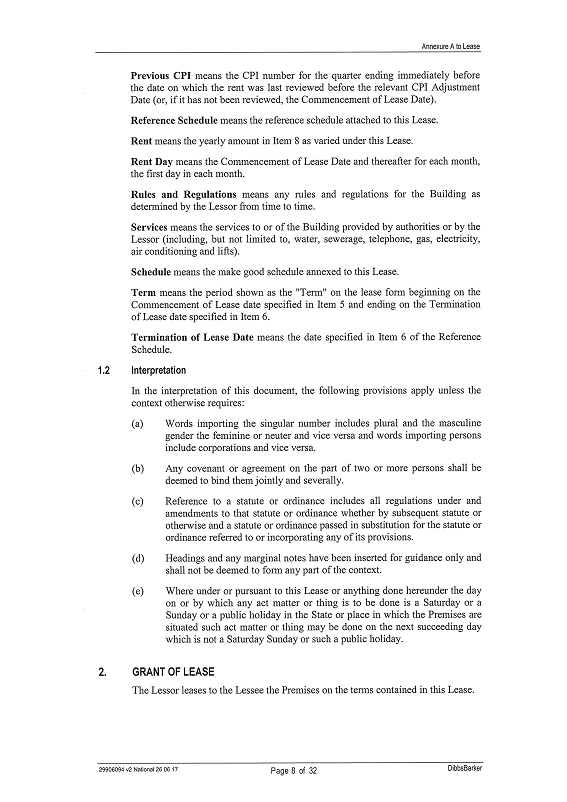 附件E A T O LEASE DIBBSBARKER 29906094 v2 NATIONAL 260617第8页,共32页以前的CPI是指在相关CPI调整日期(或,如果未经审查,则为租赁开始日期)。参考附表是指附于本租约的参考附表。租金是指根据本租约变更的第8项中的年度金额。租金日是指租赁日期的开始日期,之后每个月的第一天,每个月的第一天。规则和条例是指出租人不时确定的建筑物的任何规则和条例。服务是指当局或出租人向建筑物提供的服务(包括但不限于水、污水、电话、煤气、电力、空调和电梯)。附表是指附在本租约中的完善附表。期限是指在租赁表上显示为“期限”的期间,从第5项规定的租赁日期开始,到第6项规定的租赁日期终止。租赁终止日期是指参考附表第6项中规定的日期。解释在对本文件的解释中,除非上下文另有要求,否则以下规定适用:1.2(a)表示单数的词包括复数和男性,女性或中性,反之亦然,表示人的词包括公司,反之亦然。两个或两个以上的人的任何契约或协议应被视为对他们共同和个别地具有约束力。对法规或条例的提述包括该法规或条例下的所有规例和对该法规或条例的修订,无论是通过随后的法规或其他方式,以及为替代提及或纳入其任何条文的法规或条例而通过的法规或条例。标题和任何边际注释仅供参考,不应被视为构成上下文的任何部分。如果根据或根据本租约或根据本租约所做的任何事情,任何行为事项或事情的完成日期是星期六或星期日或该州的公共假期或处所所在的地方,此类行为事项或事情可以在下一个非星期六星期日或此类公共假期的次日进行。(b)(c)(d)(E)2。总租赁出租人根据本租约中包含的条款将房屋出租给承租人。