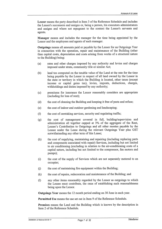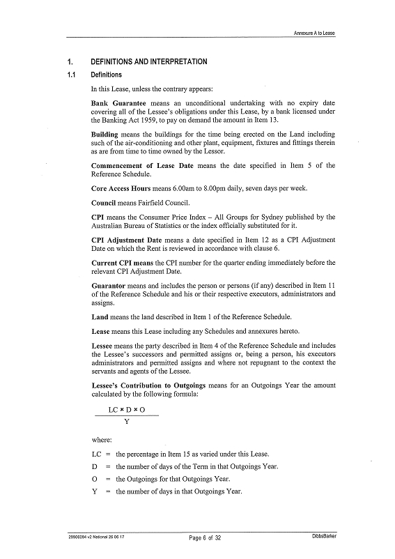 附件E A T O LEASE DIBBSBARKER 29906094 v2 NATIONAL 260617第6页,共321。1.1定义S和D本租约中的解释定义,除非出现相反情况:银行担保是指由根据1959年银行法获得许可的银行提供的无条件承诺,没有到期日,涵盖承租人在本租约下的所有义务,按要求支付第13项中的金额。建筑物是指当时在土地上建造的建筑物,包括出租人不时拥有的空调和其他厂房、设备、固定装置和配件。租赁开始日期是指参考附表第5项中规定的日期。核心访问时间是指每周7天,每天早上6点至晚上8点。委员会是指费尔菲尔德委员会。CPI是指由澳大利亚统计局发布的悉尼所有组的消费者价格指数或正式替代它的指数。CPI调整日是指第12项中指定的作为根据第6条对租金进行审查的CPI调整日的日期。当期CPI是指在紧接相关CPI调整日期之前结束的季度的CPI数字。担保人是指并包括参考附表第11项中描述的一个或多个人(如果有)及其各自的遗嘱执行人、管理人和受让人。土地是指参考附表第1项中描述的土地。租约是指本租约,包括任何附表和附件。承租人是指参考附表第4项中的DESC 1 IBED一方,包括承租人的继任者和允许的受让人,或者作为一个人,他的遗嘱执行人管理人和允许的受让人,如果与上下文不符,则包括承租人的雇员和代理人。承租人对支出的贡献是指在一个支出年度,按以下公式计算的金额:LC x D x 0 y其中:LC第15项中的百分比,根据本租约而变化。d该支出年度的学期天数。0该支出年度的支出。Y =该支出年度的天数。