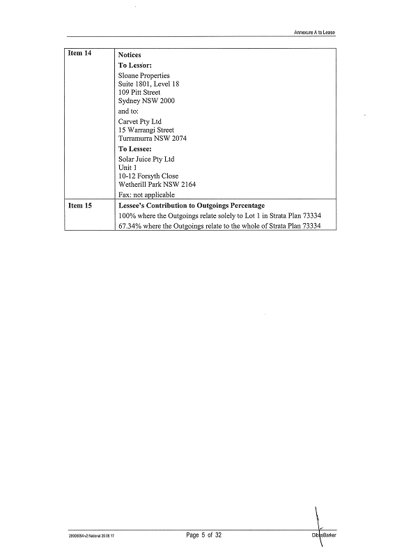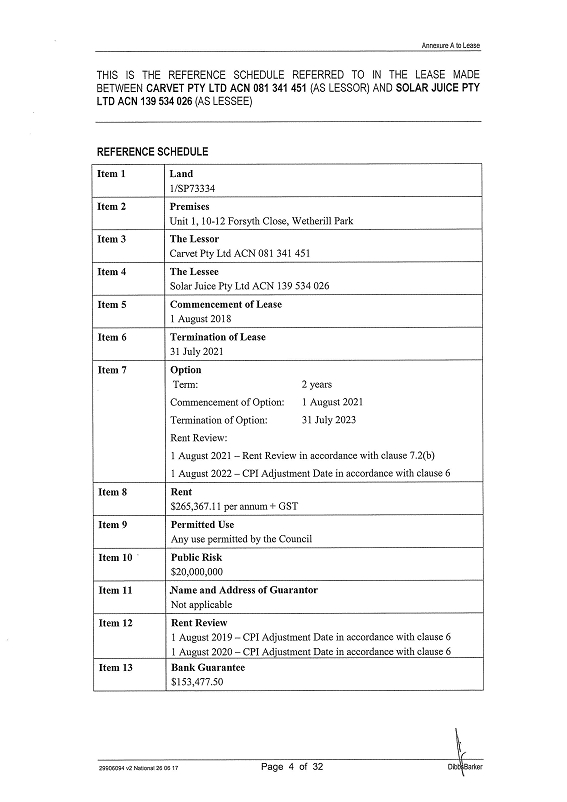 项目1 Land L/SP73334 LTEM2 Premises Unit 1,10-12 Forsyth Close,Wetherill Park LTEM3出租人Carvet PTY有限公司ACN 081341451 LTEM4承租人Solar Juice PTY有限公司ACN 139534026项目5租赁开始2018年8月1日项目6租赁终止2021年7月31日项目7选择权期限:2年选择权开始时间:2021年8月1日终止选择:2023年7月31日租金审查:2021年8月1日-根据第7.2(b)条进行的租金审查2022年8月1日-根据第6条进行的CPI调整日期LTEM8租金每年265,367.11美元+第9项商品及服务税允许使用理事会规定的任何用途LTEMLO Public风险$ 20,000,000项目11. Name和担保人的地址不适用第12项租金审查2019年8月1日-根据第6条的CPI调整日期2020年8月1日-根据第6条的CPI调整日期第13项银行担保$ 153,477.50 Page 4 of 32 29906094 v2 National 260617 Annexur这是Carvet PTY有限公司ACN 081314451(作为出租人)和Solar Juice PTY LT AC N 139534026(作为承租人)之间订立的租约中提及的参考附表