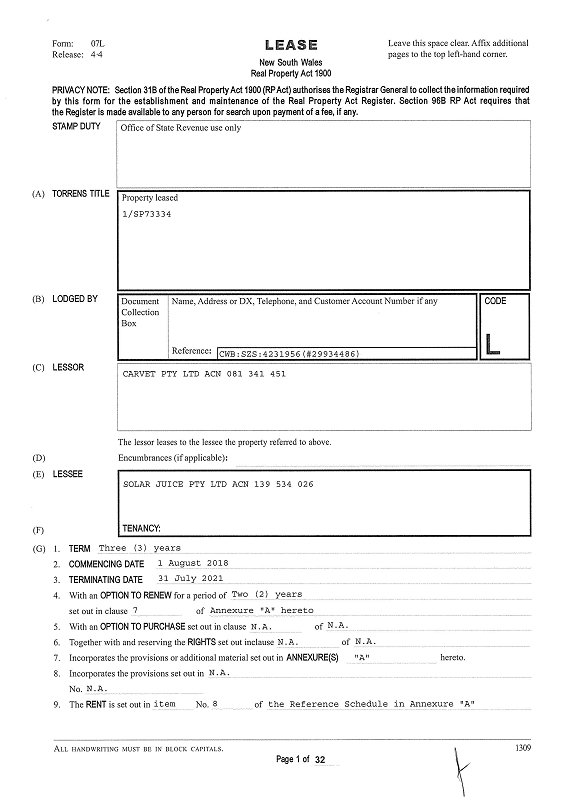 FON11:07L发布:4·4 LEASE NE W SOUT H WALES REA L PROPERT Y AC T 1900隐私注:《1900年不动产法》第31 B节授权注册总署收集本表格要求的信息,用于建立和维护《不动产法》登记册。RP法案第968条要求在支付费用(如果有)后,任何人都可以使用登记册进行搜索。STAM P州税务局仅使用我的财产租赁1/SP73334文件我的姓名,地址或DX,电话和客户帐号,如果有的话I代码L收集箱参考:LCWB:SZS:4231956(# 29934486)离开这个空间清除。在左上角附加页面。(a)Torren的所有权(b)由(c)出租人(d)(e)承租人I CARVE T PT Y LT D ACN 08131451出租人将上述财产出租给承租人。产权负担(如适用):Solar Juice Pty Ltd ACN 139534026租赁:(F)(G)1。TER三(3)年2。开始日期3。终止日期2018年8月1日2021年7月31日4。可选择续约两(2)年,如本协议附件“A”第7条所述5。与购买有关的期权一起提出。A. 6。连同并保留规定的权利,包括N.A. of N.A. of N.A. 7。包含附件(s)8中规定的条款或附加材料。包含N. A. No.中规定的条款。不适用“A”到此。9.附件“A”中参考附表第8号中列出的所有笔迹必须用大写字母。1309 PAG E 1 OF 32