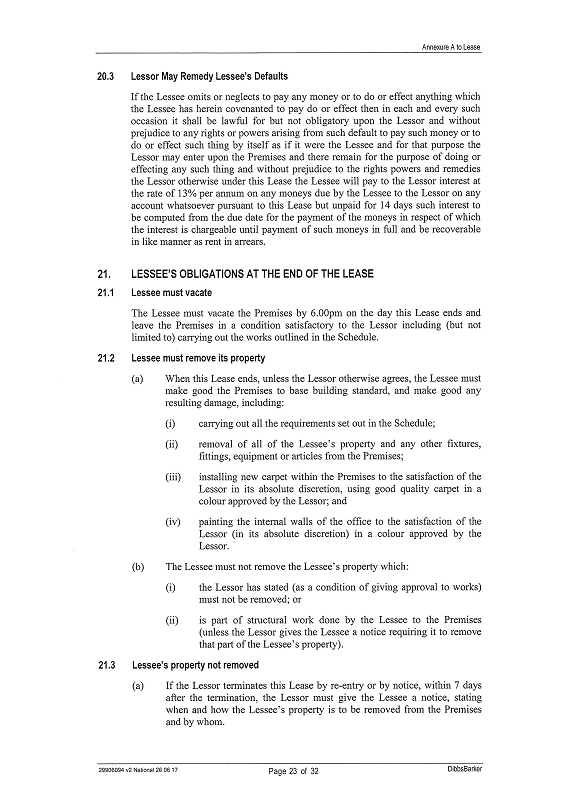 附件A租赁20。3如果承租人遗漏或疏忽支付任何款项或做或实现承租人在此承诺支付的任何事情,则承租人可以对承租人的违约进行补救并且在每一次此类情况下,出租人都是合法的,但不是强制性的,并且不影响因此类违约而产生的任何权利或权力,以支付此类款项或自行做或实现此类事情如果是承租人并且对于为此目的,出租人可以进入该处所,并且在不影响权利权力的情况下,为了做或实现任何此类事情而保留该处所和补救出租人在本租约下的其他情况下,承租人将按13%的年利率向出租人支付承租人根据本租约以任何账户应付给出租人但未支付的任何款项的利息为期14天的利息,自支付应收取利息的款项的到期日起计算,直至该等款项全额支付为止,并可按与拖欠租金相同的方式收回。21.承租人在租赁结束时的义务1。承租人必须在6日之前腾出房屋。本租约结束之日下午00点,并使房屋处于出租人满意的状态,包括(但不限于)执行附表中列出的工程。2.LESSE E MUS T REMOV E IT S PROPERTY DIBBSBARKER 29906094 v2 NATIONAL 260617第23页,共32(a)当本租约结束时,除非出租人另有约定,否则承租人必须按照基本建筑标准修复房屋,并修复任何由此产生的损害,包括:(i)执行附表中规定的所有要求;拆除承租人的所有财产和任何其他固定装置、配件、处所的设备或物品;在房屋内安装新地毯,使出租人完全满意,使用出租人批准的颜色的优质地毯;以出租人批准的颜色粉刷办公室的内墙,使出租人满意(全权酌情决定)。(b)承租人不得移走承租人的财产:(i)出租人已声明(作为批准工程的条件)不得移走;或是承租人对房屋进行的结构工作的一部分(除非出租人向承租人发出通知,要求其移除承租人财产的该部分)。21.3承租人的财产y未拆除(a)如果出租人通过重新进入或通知终止本租约,则在终止后7天内,出租人必须向承租人发出通知,说明何时以及如何将承租人的财产从房屋中移走以及由谁移走。