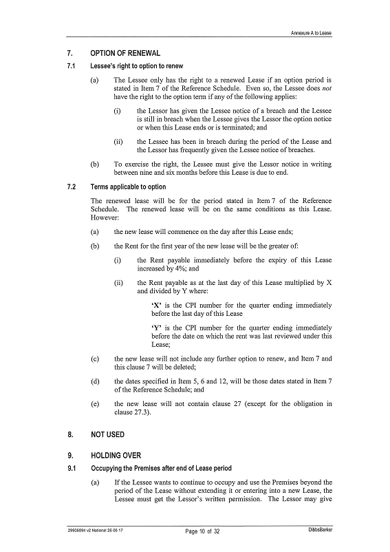附件E A T O LEASE DIBBSBARKER 29906094 v2 NATIONAL 260617第10页,共327。7.1续租的选择权承租人有权续租(a)承租人仅在参考附表第7项中规定了选择权期限的情况下才有权获得续租。即便如此,承租人无权选择条款1如果以下任何一种情况适用:(i)出租人已向承租人发出违约通知,而当承租人向出租人发出选择权通知或本租约结束或到期时,承租人仍处于违约状态;承租人在租赁期内一直违约,并且出租人经常向承租人发出违约通知。(b)为行使该权利,承租人必须在本租约到期前九至六个月内以书面形式通知出租人。7.2适用于选项的期限续租的期限为参考附表第7项所述的期限。续租的条件与本租约相同。但是:(a)(b)新租约将在本租约结束后的第二天开始;新租约第一年的租金将为:(i)紧接本租约到期前应付的租金增加4%;在本租约最后一天应付的租金乘以x并除以y,其中:‘x’是紧接本租约最后一天之前结束的季度的CPI数字‘y’是CPI数字在紧接根据本租约最后一次审查租金的日期之前结束的季度;新租约将不包括任何进一步的续约选择,第7项和本第7条将被删除;(c)(d)第5项中指定的日期,6和12,将是参考附表第7项中规定的日期;新租约将不包含第27条(第27.3条中的义务除外)。(e)8。没有用过9。9.1租赁期结束后占用房屋的保留(a)如果承租人希望在租赁期结束后继续占用和使用房屋而不延长或签订新的租赁合同,承租人必须获得出租人的书面许可。出租人可以给予