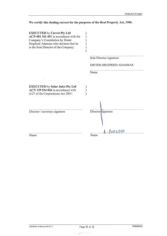附件U R E A T O LEASE我们证明本次交易符合1900年《不动产法》的目的。执行d b y carvet pt y lt d)ACN 081341451根据公司章程由Diete r)Siegfried Adamsas宣布那他是公司的董事:))唯一董事签名Dieter Siegfried Adamsas姓名Dibbsbarker 29906094 v2 National 260617第30页,共32页由Solar Juice PTY有限公司执行ACN 139534026根据S 1272001年公司法:)))董事I秘书签名董事姓名