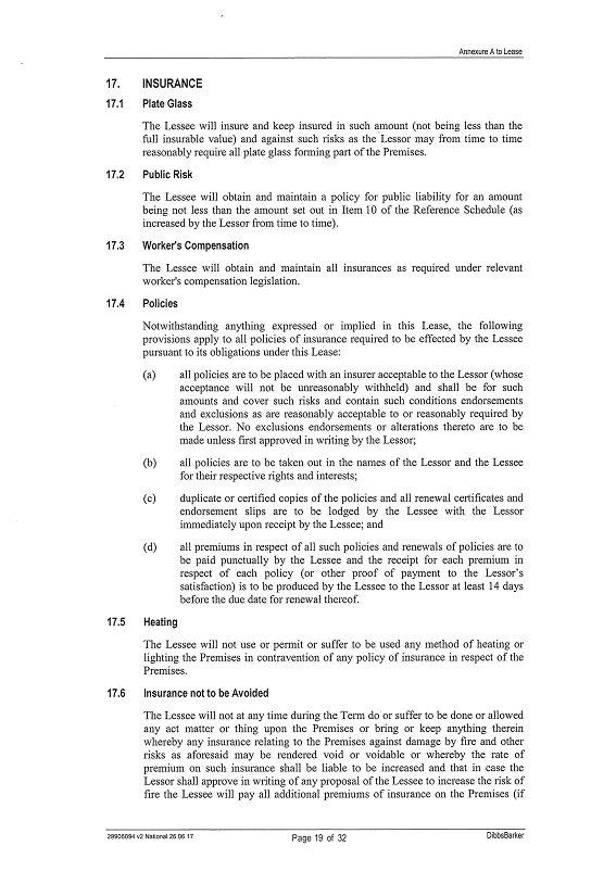 附件E A T O LEASE 17。保险1。Plat e Glass承租人将投保并保持投保金额(不低于全部可保价值)和出租人可能不时合理要求场所的所有平板玻璃翻模部分的风险。2.公开风险承租人将获得并维持一项公共责任政策,其金额不低于参考表第10项中规定的金额(出租人不时增加)。3.承租人将根据相关工人赔偿立法的要求获得并维持所有保险。4.政策尽管本租约中有任何明示或暗示的内容,以下规定适用于承租人根据其在本租约下的义务要求实施的所有保险单:Dibbsbarker 29906094 v2 National 260617第19页,共32页(a)所有保单均应由承租人接受的保险公司投保出租人(其接受不会被无理拒绝),并应支付出租人合理接受或合理要求的金额和风险,并包含此类条件背书和排除条款。除非事先得到出租人的书面批准,否则不得对其进行排除背书或更改;所有保单均应以出租人和承租人的名义为各自的权利而采取和兴趣;承租人应在承租人收到后立即向出租人提交保单的副本或经核证的副本以及所有续保证书和签注单;以及与所有此类保单有关的所有保费承租人应按时支付续保费用承租人应在每份保单的到期日前至少14天向出租人出示每份保单的保费收据(或其他令出租人满意的付款证明)。(b)(c)(d)5。供暖承租人不得使用或允许或忍受使用任何供暖或照明房屋的方法,这违反了与房屋有关的任何保险单。6.承租人在期限内的任何时间都不会在场所内做或忍受做或允许任何行为或事情或带来或在其中保留任何与房屋有关的火灾损坏和上述其他风险的保险可能无效或可撤销的任何内容,或者此类保险的保费率可能会增加,并且如果出租人以书面形式批准承租人增加火灾风险的任何建议,承租人将支付房屋内的所有额外保险费(如果