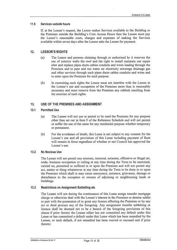 附件E A T O LEASE 11。5超出服务时间如果应承租人的要求,出租人在建筑物的核心访问时间之外向建筑物或场所提供服务,则承租人必须支付出租人的合理费用,在出租人要求承租人付款后7天内提供服务的费用和开支。12 .出租人的权利DIBBSBARKER 29906094 v2 NATIONAL 260617第13页,共32页(a)出租人和通过其索赔或授权的人保留使用外墙屋顶和安装权维护使用维修更改更换管道、管道、电缆、导管和电线穿过房屋,并通过此类管道、管道、电缆、导管和电线通过和运行水、空气、电力、污水、排水气体和其他服务,并为此目的进入房屋。在行使此类权利时,出租人不得在合理必要的范围内干扰承租人对房屋的使用和占用,并且必须从房屋中清除因行使此类权利而产生的任何垃圾。(b)13。US E O F TH E前提和D分配1。许可使用(a)承租人不得将场所用于或允许用于参考附表第9项规定以外的任何目的并且不会允许或容忍将其用于任何住宅目的,无论是临时的还是PEM 1 Anent。为免生疑问,本租约不受承租人使用的任何同意,并且无论理事会是否批准承租人的使用,本租约的所有条款(包括支付租金)将继续有效。(b)2。不得使用承租人不得在期限内的任何时间允许任何有害的、不道德的、有害的、令人反感的或非法的艺术、贸易、商业职业或呼吁在场所内或场所内行使、进行、允许或遭受并且不会允许任何行为,在期限内的任何时间在处所内或处所内进行的任何事项或事物,将或可能对相邻或相邻土地或建筑物的占用者或所有者造成烦恼、滋扰、不满、损害或干扰。3.限制转让人转租等在本租约持续期间,承租人不得转让抵押费用或以其他方式处理承租人在房屋中的权益或转租或部分占有或授予任何影响场所的许可,或通过任何行为或契约获得上述任何一项。任何转让人转让转租或许可均应视为不违反本条款的前述规定如果在此之前,承租人没有在本租约下发生任何违约,或者在本租约下发生了已由承租人补救的违约,或者此类违约,如果未补救,则已被放弃或免除,并且如果在此之前: