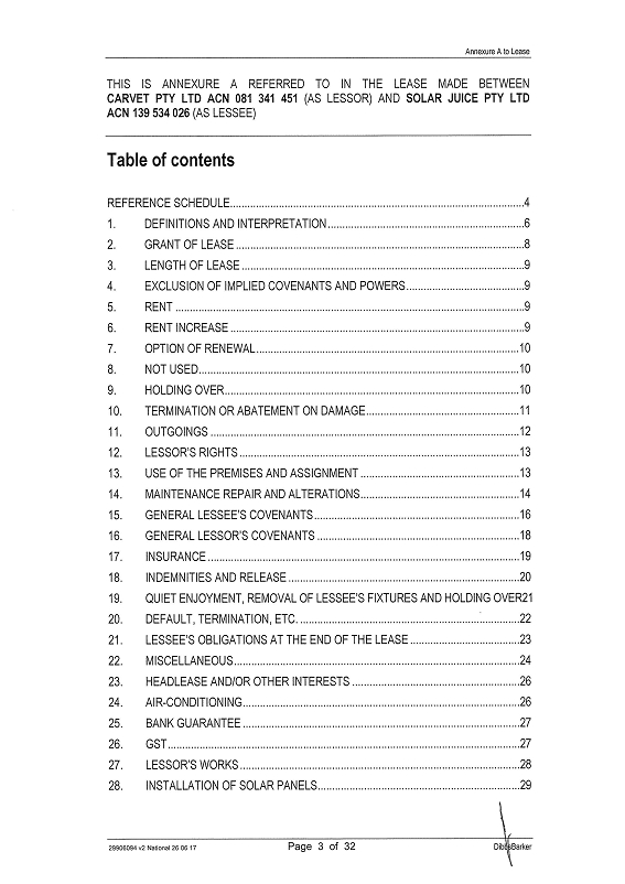 这是Carvet PTY有限公司ACN 081314451(作为出租人)和Solar Juice PTY有限公司签订的租约中提到的附件A ACN 139534026(作为承租人)第3页,共32页29906094 v2国家260617表内容参考附表.................................................................................................................................................................................................................。定义和解释n...................................................................................................................................................................................................................................................。授予租赁.........................................................................................................................................................................................................。租赁期限........................................................................................9 4。默示契约和权力的排除...................................................................................................................................................................................................................。租金……………………………………………………………………………………………………………………………………………………………………………………………………………………………………………………………………………………………………………………………………………………………………………………………………………………………………………………………………………………………………………………………………………………………………………………………………………………租金上涨...........................................................................................................................................................................................................。续订选项.................................................................................................................................................................................................。未使用…………………………………………………………………………………………………………………………………………………………………………………………………………………………………………………………………………………………………………………………………………………………………………………………………………………………………………………………………………………………………………………………………………………………………………………………持有...........................................................................................................................................................................................................。损害的终止或减轻...............................................................................................................................................................。支出..........................................................................................................................................................................................................................................................。出租人的权利.......................................................................................................................................................................................................。场地的使用和分配.................................................................................................................................................................................。维护维修和改造...................................................................................................................................................................................................................................................。一般承租人的契约.................................................................................................................................................................................。一般出租人的契约.................................................................................................................................................................................................。保险...............................................................................................................................................................................................................................。赔偿和免除...................................................................................................................................................................................................。安静的享受,拆除承租人的固定装置并保持超过2120。违约、终止等………………………………………………………………………………………………………………………………………………………………………………………………………………………………………………………………………………………………………………………………………………………………………………………………………………………………………………………………………………………………………………………………………………承租人在租赁结束时的义务…………………………………………………