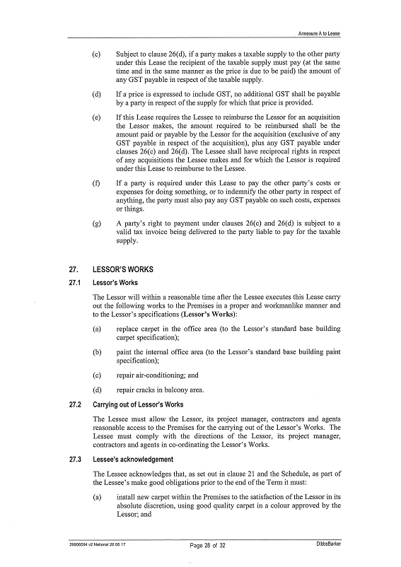 附件E A T O LEASE DIBBSBARKER 29906094 v2 NATIONAL 260617第28页,共32(c)条,受第26(d)条约束,如果一方根据本租约向另一方提供应税供应,则应税供应的接收方必须支付(同时并以与应支付的价格相同的方式)就应税供应应付的任何商品及服务税的金额。如果价格表示包括商品及服务税,则一方不得就提供该价格的供应支付额外的商品及服务税。如果本租约要求承租人就出租人进行的收购向出租人偿还,则需要偿还的金额应为出租人为收购支付或应付的金额(不包括就收购应付的任何商品及服务税),加上根据第26(c)和26(d)条应付的任何商品及服务税。承租人对承租人进行的任何收购享有互惠权利,并且根据本租约要求出租人向承租人偿还。如果本租约要求一方支付另一方因做某事而产生的成本或费用,或就任何事情向另一方作出赔偿,则该方还必须支付就此类成本、费用或事项应付的任何商品及服务税。一方根据第26(c)和26(d)条获得付款的权利取决于向有责任支付应税供应的一方交付的有效税务发票。(d)(e)(f)(g)27。出租人的作品1。出租人的工程出租人将在承租人签署本租约后的合理时间内以适当和熟练的方式对房屋进行以下工程以及出租人的规格(出租人的工程):(a)更换办公区的地毯(按照出租人的标准基础建筑地毯规格);(b)油漆内部办公区(按照出租人的标准基础建筑油漆规格);修理空调;(c)(d)修复阳台区域的裂缝。2.承租人必须允许出租人、其项目经理、承包商和代理人合理地进入房屋进行出租人的工程。承租人必须遵守出租人、其项目经理、承包商和代理人的指示,以协调出租人的工程。3.承租人的确认承租人承认,如第21条和附表所述,作为承租人在租期结束前履行良好义务的一部分,它必须:(a)在房屋内安装新地毯,使出租人完全满意,使用出租人批准的颜色的优质地毯;和