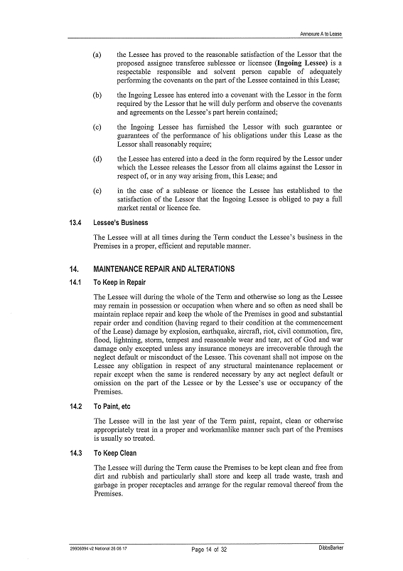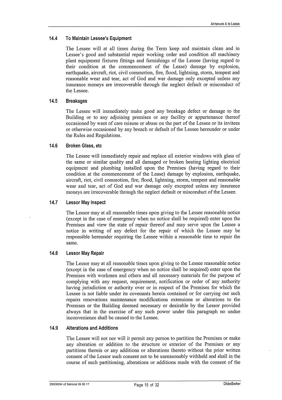 附件E A T O LEASE DIBBSBARKER 29906094 v2 NATIONAL 260617第14页,共32页(a)承租人已证明出租人合理满意拟议的受让人受让人转承租人或被许可人(即将承租人)是一位受人尊敬的责任人有偿付能力的人能够充分履行本租约中包含的承租人的契约;即将承租人已按照出租人要求的形式与出租人订立契约他将适当履行和遵守契约以及此处包含的承租人方面的协议;即将承租人已向出租人提供此类担保或担保,以履行其在本租约下的义务出租人应合理要求;承租人已按照出租人要求的形式签订契约,根据该契约,承租人免除出租人因以下原因或以任何方式向出租人提出的所有索赔:本租约;在转租或许可的情况下,承租人已确定出租人有义务支付全额市场租金或许可费,并使出租人满意。(b)(c)(D)(E)13。4承租人的业务承租人将在期限内始终以适当、高效和信誉良好的方式在场所内开展承租人的业务。14.保养维修TER 1。t o kee p i n维修承租人将在整个期限内进行维修,否则只要承租人可以在需要的时间和频率保持占有或占用更换维修并保持整个房屋处于良好和实质性的维修秩序和状况(考虑到租赁开始时的状况)因爆炸、地震、飞机、骚乱、内乱、火灾、洪水、闪电、风暴、暴风雨而造成的损坏和合理的磨损,天灾和战争损害除外,除非任何保险金因承租人的疏忽违约或不当行为而无法收回。本契约不应对承租人施加任何与任何结构维护更换或修理有关的义务,除非由于承租人的任何疏忽或疏忽或承租人使用或占用房屋而有必要这样做。2.油漆等承租人将在术语的最后一年以适当和熟练的方式油漆、重新油漆、清洁或以其他方式适当处理房屋的此类部分通常如此处理。3.t o kee p清洁承租人将在tem 1期间保持房屋清洁,没有污垢和垃圾,特别是应储存和保存所有贸易废物,垃圾和垃圾放入适当的容器中,并安排定期将其从场所中清除。