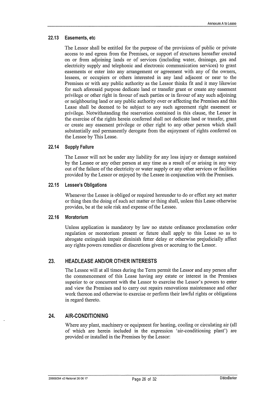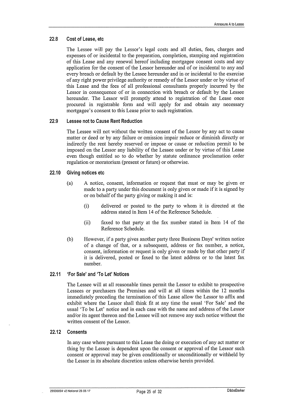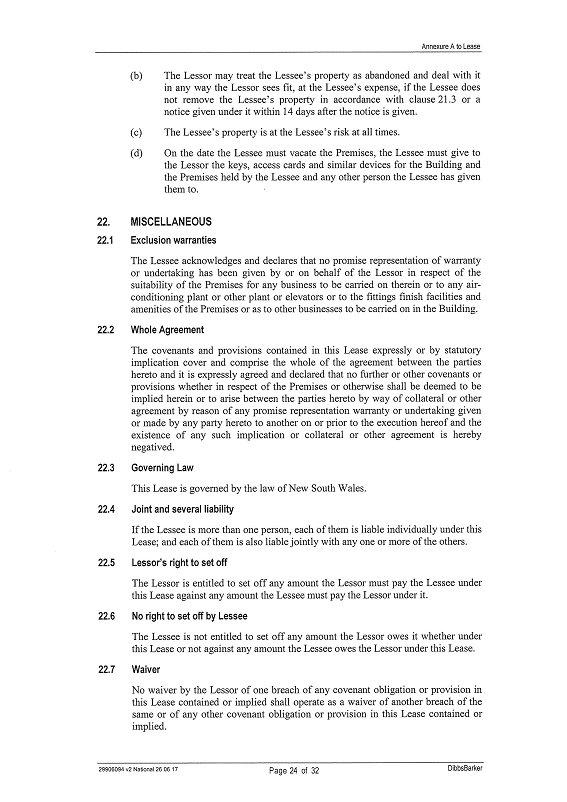 附件E A T O LEASE DIBBSBARKER 29906094 v2 NATIONAL 260617第24页,共32页(b)出租人可以将承租人的财产视为已放弃,并以出租人认为合适的任何方式进行处理,费用由承租人承担,如果承租人没有按照第21条的规定移走承租人的财产。3或在发出通知后14天内根据本协议发出的通知。承租人的财产在任何时候都由承租人承担风险。在承租人必须腾出房屋之日,承租人必须向出租人提供由承租人和承租人提供给他们的任何其他人持有的建筑物和房屋的钥匙、门禁卡和类似设备。(c)(d)22。杂项1。承租人承认并声明的独家保证出租人或代表出租人未就房屋的适用性作出任何保证或承诺的承诺声明在其中开展的任何业务,或任何空调设备或其他设备或电梯,或场所的配件完成设施和便利设施,或在建筑物内开展的其他业务。2.WHOL E协议本租约中包含的契约和规定明示或以法定含义涵盖并构成本协议双方之间的全部协议,并明确同意和声明任何进一步或其他契约或规定,无论是关于场所还是其他方面,均不应被视为在本协议中暗示或在本协议双方之间通过抵押品或其他协议因任何承诺陈述而产生本协议任何一方在执行本协议时或之前向另一方作出或作出的承诺,特此否定任何此类暗示或抵押品或其他协议的存在。3.Governin G法律本租约受新南威尔士州法律管辖。4.加入T和Severa l责任如果承租人不止一个人,他们每个人都根据本租约单独承担责任;并且他们每个人也与任何一个或多个其他人共同承担责任。5.出租人有权将出租人根据本租约必须支付给承租人的任何金额与承租人根据本租约必须支付给出租人的任何金额相抵销。6.承租人无权将出租人在本租约下欠出租人的任何金额与承租人在本租约下欠出租人的任何金额相抵销。7.出租人对一次违反本租约中包含或暗示的任何契约义务或规定的弃权不得视为对另一次违反本租约中包含或暗示的相同或任何其他契约义务或规定的弃权。