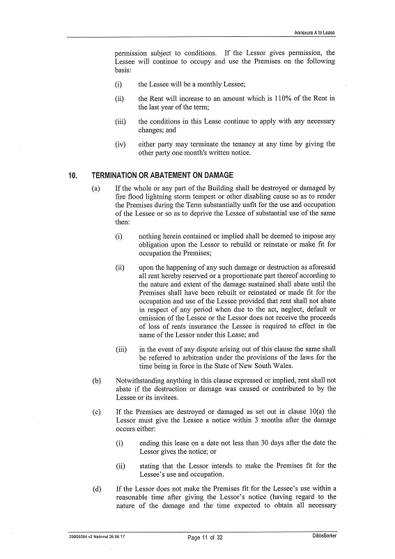 附件E A T O LEASE PENMSS 1受条件限制。如果出租人给予许可,承租人将继续占用并在以下基础上使用场地:Dibbsbarker 29906094 v2 National 260617第11页,共32页(i)承租人将是每月承租人;租金将增加至租金的110%任期的最后一年;本租约中的条件继续适用,但有任何必要的更改;任何一方均可在任何时间提前一个月书面通知另一方租赁。10 .终止或终止损坏(a)如果建筑物的全部或任何部分因火灾、闪电、风暴或其他致残原因而被毁坏或损坏,从而使房屋在期限内基本上不适合使用和占用承租人或以剥夺承租人对其的大量使用然后:(i)此处包含或暗示的任何内容均不应被视为对出租人施加任何重建或恢复或适应的义务占用处所;在发生上述任何此类损坏或破坏时,特此保留所有租金或根据性质保留的第01号提案部分所遭受的损害和程度应减轻,直到房屋被重建或恢复或适合承租人的占用和使用,前提是租金不得在任何时期因行为、疏忽、承租人的违约或遗漏或出租人未收到承租人根据本租约必须以出租人的名义投保的租金损失保险收益;如果因本条款引起任何争议,应根据新南威尔士州当时有效的法律规定提交仲裁。(B)尽管本条款中有任何明示或暗示的内容,如果破坏或损坏是由承租人或其受邀人造成或促成的,则租金不会减少。如果房屋被毁坏或损坏如第10(a)条所述,出租人必须在损坏发生后3个月内向承租人发出通知:(c)(i)终止本租约的日期不少于出租人发出通知之日起30天内;或说明出租人打算使房屋适合承租人的使用和占用。(d)如果出租人在发出出租人通知后的合理时间内(考虑到损坏的性质和预期获得所有必要的时间)