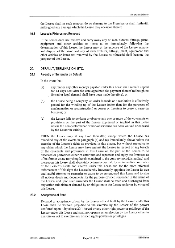 租赁附件承租人在搬迁时不得对房屋造成损坏,也不得对承租人可能造成的任何损坏进行赔偿。19.3承租人的固定装置不得拆除如果承租人未在本租约确定时或之后立即拆除和带走任何此类固定装置、配件、厂房、设备和其他物品或物品,出租人可以自费拆除和处置这些固定装置、配件、厂房、设备和其他物品或物品,上述任何此类固定装置、配件、厂房、设备和其他物品或物品均应成为出租人的财产。20.默认、终止等1。在事件中重新ENTR和放弃违约即:Dibbsbarker 29906094 v2 National 260617第22页,共32页(a)根据本租约应付的任何租金或任何其他款项应在指定日期后的14天内保持未付状态付款(尽管不应因此提出正式或法律要求);或承租人是一家公司,为承租人的清盘作出命令或有效通过决议(不包括为合并或重建目的)或停止或威胁停止经营业务;(b)(c)承租人未能履行或遵守承租人所表达的任何一项或多项契约或规定或在本租约中暗示,除非出租人以书面形式放弃或免除不履行或不遵守,否则出租人可以在此后的任何时间,除非承租人在行使本条规定的出租人权利之前已纠正了上文(a)和(c)段中的任何事件,但不影响出租人可能因违反本租约中关于承租人PMI的契约和规定而向承租人提出的任何索赔,以遵守或履行重新订立和收回并享受其前遗产的处所(尽管此处包含任何相反的内容),因此本租约应绝对确定,或要求立即交出承租人在本租约下的财产和权益,并为了更有效地执行此权利,承租人特此不可撤销地任命出租人其真实合法的代理人交出或促使交出本租约并以承租人的名义签署所有通知契约和文件,以进行此类交出,并且在这种放弃后,出租人应被免除并免除承租人根据或凭借本租约提出的任何诉讼索赔或要求或对承租人的义务。20.2承租人在本租约下违约后,出租人接受租金要求或接受租金不应影响出租人行使第20条授予的权力。1本协议或出租人在本租约下的任何其他权利或特权,不得作为出租人行使或不行使任何此类权利或特权的选择。