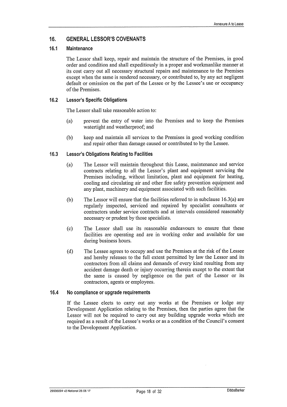 附件E A T O LEASE 16。Genera l出租人的契约1。维护出租人应保持、修理和维护房屋的结构处于良好的秩序和状态,并应自费以适当和熟练的方式迅速对房屋进行所有必要的结构维修和维护,除非有必要,或因承租人的任何疏忽违约或疏忽,或因承租人使用或占用房屋而促成。2.出租人的特定义务出租人应采取合理措施:Dibbsbarker 29906094 v2 National 260617第18页,共32页(a)防止水进入房屋并保持房屋防水和防风雨;并保持并保持场所的所有服务处于良好的工作状态并进行维修,但承租人造成或造成的损坏除外。(b)16。3出租人与设施相关的义务(a)出租人将在整个租赁、维护和服务合同中维持与出租人为场所提供服务的所有厂房和设备有关的合同,包括但不限于用于供暖的厂房和设备,冷却和循环风和其他消防安全设备以及与此类设施相关的任何厂房、机械和设备。出租人将确保第16款中提及的设施。3(a)由专家顾问或承包商根据服务合同定期检查、维修和修理,并在这些专家认为合理必要或谨慎的时间间隔内进行。出租人应尽其合理努力确保这些设施正常运行并处于工作状态并可在营业时间内使用。承租人同意由承租人承担风险占用和使用房屋,并特此在法律允许的最大范围内免除出租人及其承包商的所有索赔以及因发生在其中的任何事故损害死亡或伤害而导致的各种要求,除非该要求是由出租人或其承包商、代理人或雇员的疏忽引起的。(b)(c)(d)16.4如果承租人选择在该处所进行任何工程或提交与该处所有关的任何开发申请,则不符合或升级要求,则双方同意,出租人将无须进行任何因承租人的工程或作为市政局同意发展申请的条件而需要进行的楼宇升级工程。
