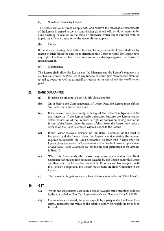 附件租赁(a)承租人不干涉:承租人将始终遵守并遵守出租人对空调设备的合理要求并且不会做或不做任何可能干扰或损害空调设备有效运行的与此相关或其他方面的事情。(b)失败:如果空调设备因任何原因无法运行,承租人无权因此而确定本租约,承租人也无权提起诉讼或提出索赔就此向出租人作出赔偿或损害赔偿。(c)维护:承租人应允许出租人和管理人以及出租人的工程师或机械师随时进入房屋进行检查,注意维护和修理以及安装或更换全部或任何空调设备。25.Ban K保证(a)如果有第13项中的金额,则适用本条款。Dibbsbarker 29906094 v2 National 260617 Page 27 of 32(b)在租赁日期开始时或之前,承租人必须向出租人交付银行担保。如果承租人不遵守承租人在本租约下的任何义务,或者如果出租人因出租人加利福尼亚州 1111未获得对房屋的占有而遭受损害,则根据本租约的条款,出租人已获得占有权,出租人可在不通知承租人的情况下要求银行保函。如果出租人对银行保函提出要求,或租金增加,并且出租人向承租人发出通知,说明恢复银行保函所需的金额,不迟于出租人发出通知后7天,承租人必须向出租人提供替代或额外的银行担保,以使担保金额为第13项中的金额。当本租约结束时,出租人可以就承租人在本租约下应付的未偿还款项向银行保函提出要求,然后在承租人腾出房屋并履行承租人的义务后,出租人必须将银行保函退还给承租人。承租人在第25条下的义务是本租约的基本条款。(c)(d)(e)(F)26。GST(a)本条款中使用的词语和表达与称为1999年新税收制度(商品和服务税)法的法案中的含义相同。(b)除非另有说明,一方根据本租约为供应支付的价格代表应支付价格的应税供应的价值。