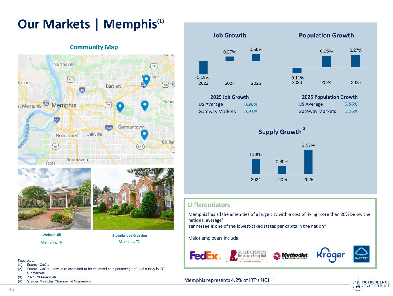44社区地图工作增长人口增长供应增长22025年工作增长美国平均0.96%网关市场0.91% 2025年人口增长美国平均0.56%网关市场0.76%微分器都会区工作增长预计到20254年将超过全国速度甲骨文计划在市场上扩张。新增8500个工作岗位,将在新项目上投资12亿美元主要雇主包括:Our Markets | Nashville(1)脚注:(1)来源:COStar(2)来源:COStar,预计交付的新单位占IRT子市场总供应量的百分比(3)2024年Q3财务(4)房利美Multifamily Metro Outlook 2021 Q3 Nashville占IRT NOI(3)着陆量的5.2% Brentwood Brentwood,TN TERM0农场Smyrna,TN 1.91% 1.30% 1.11% 2023202420251.45% 1.28% 1.19% 2023202420253.49% 2.43% 0.76% 202420252026