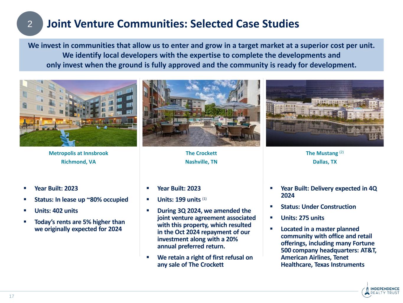 17个合资社区:精选案例研究▪建成年份:2023年▪状态:租赁中up~80%占用▪单位:402个单位▪今天的租金比我们最初预期的2024年野马(2)德克萨斯州达拉斯The Crockett Nashville,TN Metropolis at Innsbrook Richmond,VA高出5%▪建成年份:2023年▪机组:199台(1)▪在2024年第三季度,我们修改了与该物业相关的合资协议,这导致在2024年10月偿还我们的投资以及20%的年度优先回报。▪我们对Crockett的任何销售保留优先购买权▪建成年份:预计2024年第四季度交付▪状态:在建▪单位:275个▪位于一个总体规划的社区,提供办公和零售产品,包括许多世界500强公司总部:美国电话电报、美国航空、泰尼特保健、德州仪器,我们投资于社区,使我们能够以优越的单位成本进入目标市场并在其中发展壮大。我们物色具有专业知识的本地开发商来完成开发,并且只有在地面完全批准和社区准备好开发时才进行投资。2