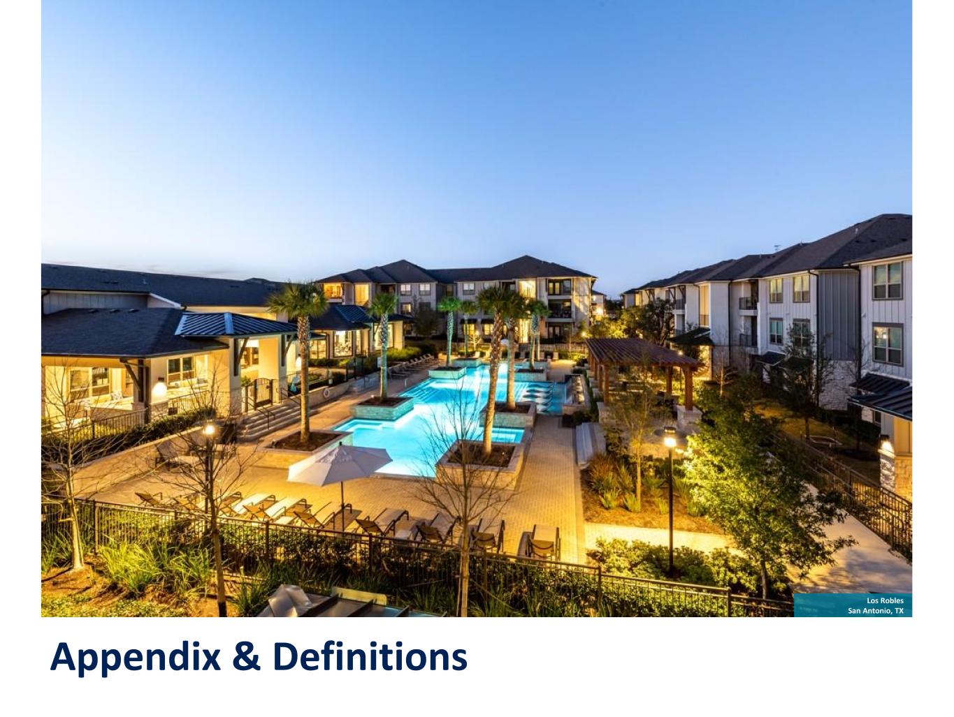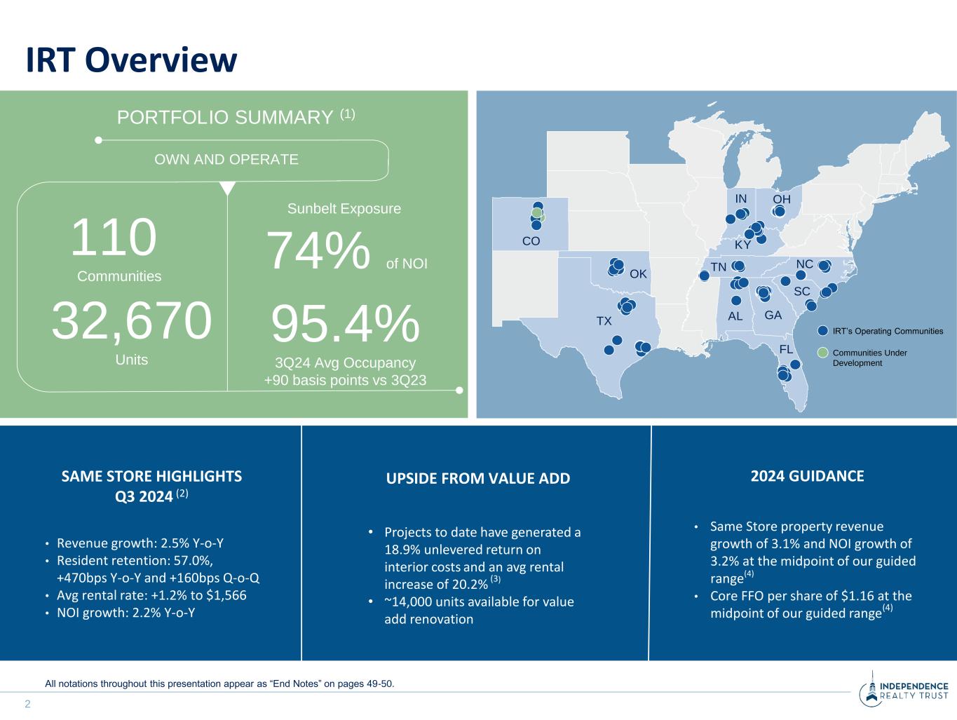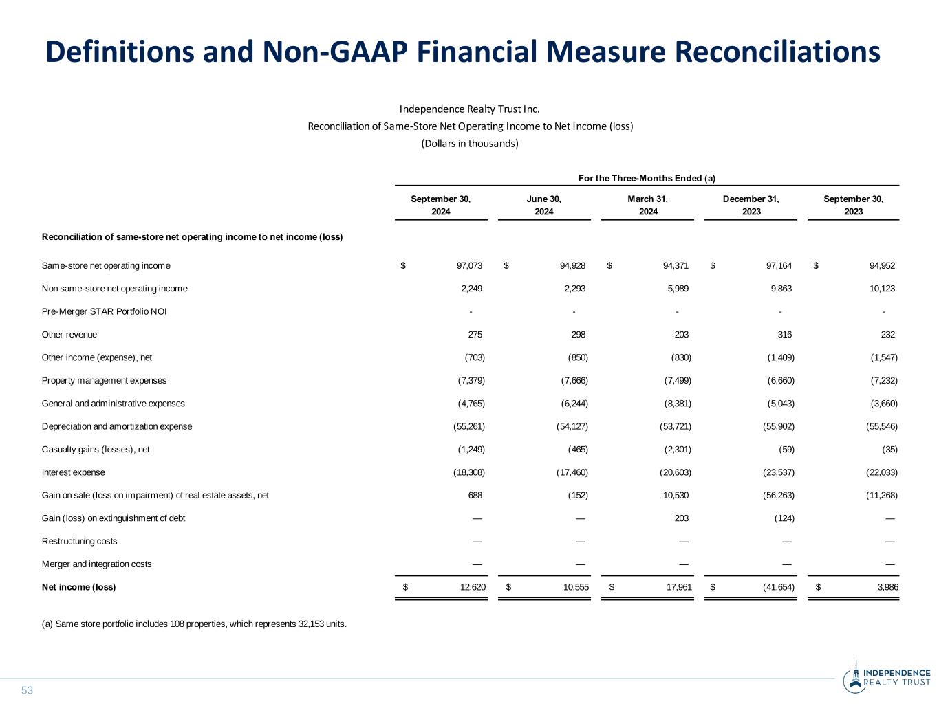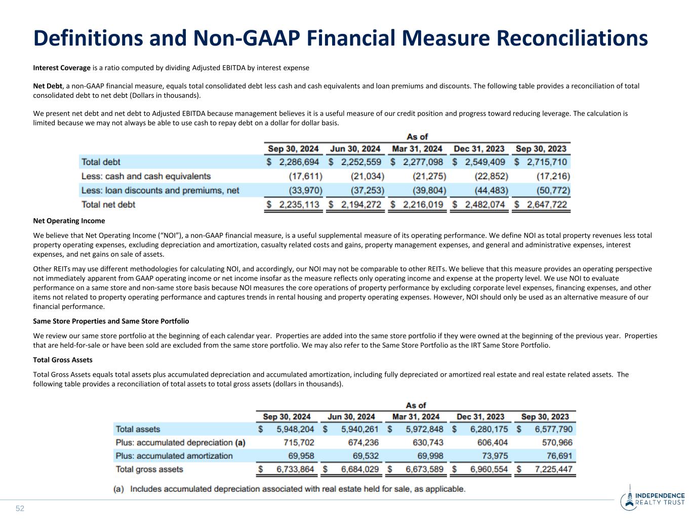 51定义和非美国通用会计准则财务指标对账本演示文稿可能包含非美国公认会计原则(“GAAP”)财务指标。这些非GAAP财务指标与最直接可比的GAAP财务指标的对账包含在本文件和/或IRT向SEC提交或提供的报告中,可在IRT网站www.IRTLIVING.com的“投资者关系”下查阅。IRT向SEC提交的其他文件也可通过该网站查阅。每单位平均有效月租金每单位平均有效租金表示总租金金额的平均值,除以所示期间的平均入住率(单位)。IRT认为,单位平均有效租金是评估平均定价的一个有用的衡量标准。这一指标在提出时反映了每月的平均有效租金。同店平均入住率同店平均入住率是指本报告所述期间的平均占用单位除以本报告所述期间可供出租的总单位的平均值。EBITDA和调整后EBITDA EBITDA定义为扣除利息费用的净收入,包括递延融资成本摊销、所得税费用以及折旧和摊销费用。调整后EBITDA是与资产出售、债务清偿和收购相关债务清偿费用、伤亡损失和放弃交易成本等项目相关的某些其他非现金或非经营性损益之前的EBITDA。EBITDA和调整后EBITDA均为非GAAP衡量标准。IRT认为EBITDA和调整后EBITDA是对业绩的适当补充衡量标准,因为它消除了利息、所得税、折旧和摊销以及其他非现金或非经营性损益,这使投资者能够在没有这些非现金或非经营性项目的情况下查看运营收入。IRT对调整后EBITDA的计算不同于某些其他REITs计算调整后EBITDA所使用的方法,因此,IRT的调整后EBITDA可能无法与其他REITs报告的调整后EBITDA进行比较。来自运营的资金(“FFO”)和来自运营的核心资金(“CFFO”)我们认为,FFO和核心FFO(“CFFO”),每一项都是非公认会计准则财务指标,是衡量房地产投资信托基金尤其是我们的经营业绩的额外适当衡量标准。我们根据美国房地产投资信托协会(“NAREIT”)制定的标准计算FFO,作为分配给普通股的净收入或亏损(按照公认会计原则计算),不包括与房地产相关的折旧和摊销费用、房地产销售的损益以及会计原则变化的累积影响。虽然我们对FFO的计算符合NAREIT的定义,但它可能与其他REITs使用的FFO计算方法不同,因此可能无法与这类其他REITs的FFO计算进行比较。CFFOO是分析师和投资者通过从FFO的确定中剔除不反映正在进行的物业运营的项目的影响,来衡量房地产公司的经营业绩,包括未纳入FFO的其他项目的折旧和摊销,以及与伤亡(收益)损失、放弃交易成本、贷款溢价和贴现摊销、债务清偿成本以及合并和整合成本等项目相关的其他非现金或非经营性损益。我们对CFFO的计算可能与其他REITs计算CFFO的方法不同,因此,我们的CFFO可能无法与其他REITs报告的CFFO进行比较。我们的管理层使用FFO和CFFO作为我们经营业绩的衡量标准,并认为它们对投资者也很有用,因为它们有助于理解我们在对某些非现金或非经常性项目进行调整后的经营业绩,这些项目被GAAP要求计入费用,但可能不一定表明当前的经营业绩和我们在不同时期之间的经营业绩。此外,尽管FFO、CFFO和其他补充业绩衡量标准在整个REIT行业中有不同的定义,但我们认为FFO和CFFO可能会为我们和我们的投资者提供一个额外的有用衡量标准,以将我们的财务业绩与某些其他REIT进行比较。FFO和CFFO都不等同于根据公认会计原则确定的经营活动产生的净收入或现金。此外,FFO和CFFO并不代表由于所需的资本置换或扩张、偿债义务或其他承诺或不确定性而可供管理层酌情使用的金额。因此,FFO和CFFO并不衡量现金流是否足以满足我们所有的现金需求, 包括本金摊销和资本改善。FFO和CFFO都不应被视为作为衡量我们经营业绩的指标的净收入或任何其他GAAP衡量标准的替代方案,或作为衡量我们流动性的经营、投资和融资活动现金流的替代方案。
