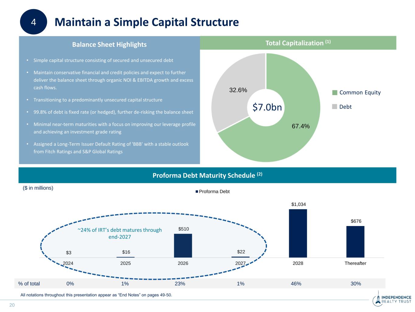 20 $ 3 $ 16 $ 510 $ 22 $ 1,034 $ 67620242025202620272028此后的备考债务67.4% 32.6%维持简单的资本Structure 70亿美元普通股债•由有担保和无担保债务组成的简单资本结构•维持保守的财务和信贷政策,并期望通过有机NOI & EBITDA增长和超额现金流进一步实现资产负债表。•向以无担保为主的资本结构过渡•99.8%的债务是固定利率(或对冲),进一步降低了资产负债表的风险•最小的近期到期日,重点是改善我们的杠杆状况并实现投资级评级•给予惠誉评级‘BBB’的长期发行人违约评级,展望稳定,而标普全球评级总资本化(1)资产负债表突出显示形式债务到期时间表(2)本演示文稿中的所有符号在第49-50页显示为“结束注释”。占总额的%0% 1% 23% 1% 46% 30% 4~24%的IRT债务将于2027年底到期(百万美元)