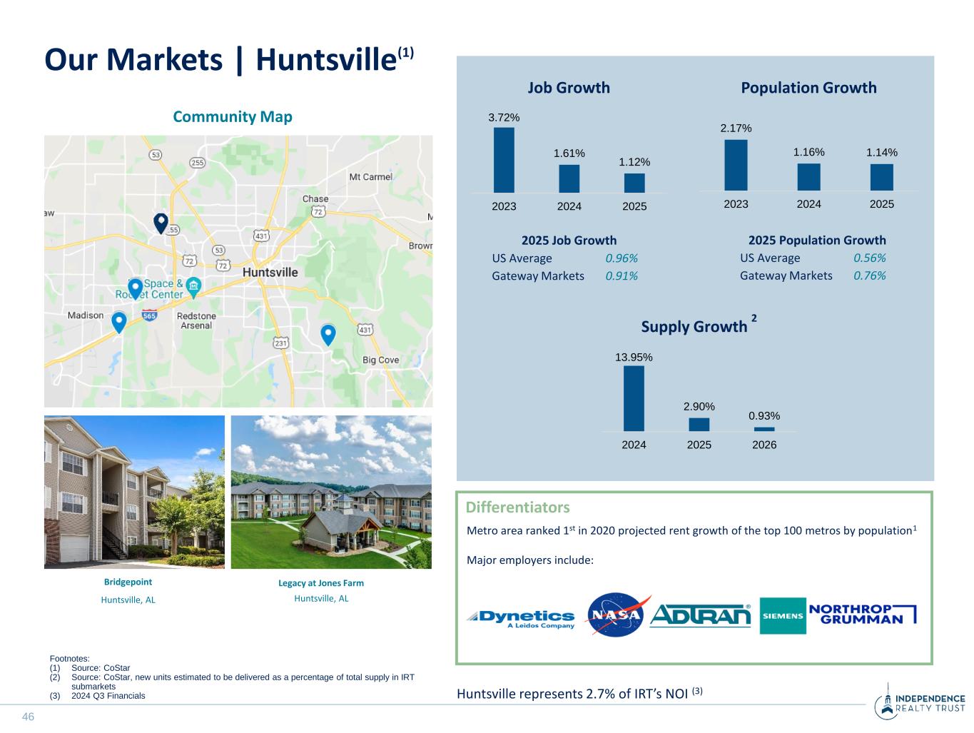 46社区地图工作增长人口增长供应增长22025年工作增长美国平均0.96% Gateway Markets 0.91% 2025人口增长美国平均0.56% Gateway Markets 0.76% Differentiators Metro Area在2020年人口排名前100的Metro中排名第1预计租金增长1主要雇主包括:Our Markets | Huntsville(1)脚注:(1)来源:COStar(2)来源:COStar,预计交付的新单位占IRT子市场总供应量的百分比(3)2024年第三季度财务数据Huntsville占IRT NOI(3)的2.7% Bridgepoint Huntsville,Jones Farm Huntsville的AL Legacy,AL 3.72% 1.61% 1.12% 2023202420252.17% 1.16% 1.14% 20232024202513.95% 2.90% 0.93% 202420252026