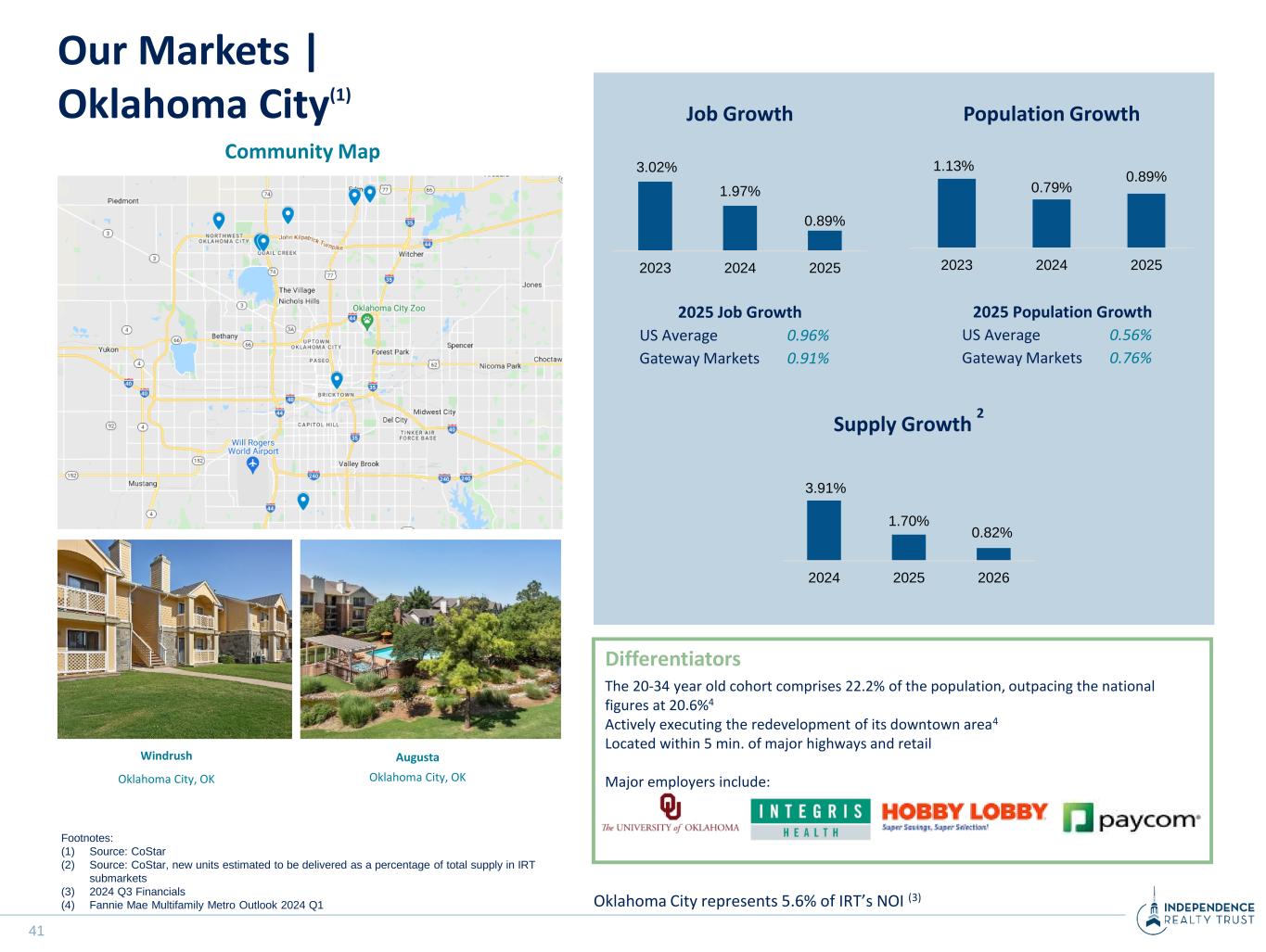 41社区地图工作增长人口增长供应增长22025年工作增长美国平均0.96% Gateway Markets 0.91% 2025人口增长美国平均0.56% Gateway Markets 0.76%差异化因素20-34岁的人群占人口的22.2%,超过了20.6%的全国数字4积极执行其市中心区域的重建4位于5分钟内。主要高速公路和零售业的主要雇主包括:我们的市场|俄克拉何马城(1)脚注:(1)来源:COStar(2)来源:COStar,预计交付的新单位占IRT子市场总供应量的百分比(3)2024年第三季度财务(4)房利美多户地铁展望2024年第一季度俄克拉荷马城占IRT NOI的5.6%(3)Windrush Oklahoma City,OK Augusta Oklahoma City,OK 3.02% 1.97% 0.89% 2023202420251.13% 0.79% 0.89% 2023202420253.91% 1.70% 0.82% 202420252026