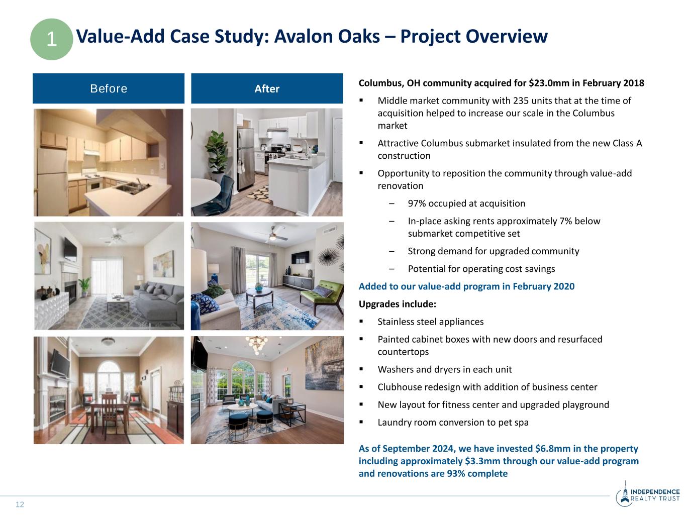 12个增值案例研究:Avalon Oaks – Columbus之后的项目概述,OH社区于2018年2月以23.0mm美元收购▪235套房源的中盘社区在收购时帮助增加了我们在哥伦布市场的规模▪有吸引力的哥伦布子市场与新的甲级建筑绝缘▪通过增值改造重新定位社区的机会–收购时占据97% –原地要价比次市场竞争套装低约7%的租金–升级社区的强劲需求– 2020年2月我们的增值计划增加了运营成本节约的潜力升级包括:▪不锈钢家电▪带新门和重铺台面的彩绘橱柜盒子▪洗衣机和每个单元的烘干机▪会所重新设计,增设商务中心▪健身中心、升级游乐场新布局▪洗衣房改成宠物水疗截至2024年9月,我们已通过增值计划向该物业投资6.8mm,其中包括约3.3mm,装修已完成93% 1