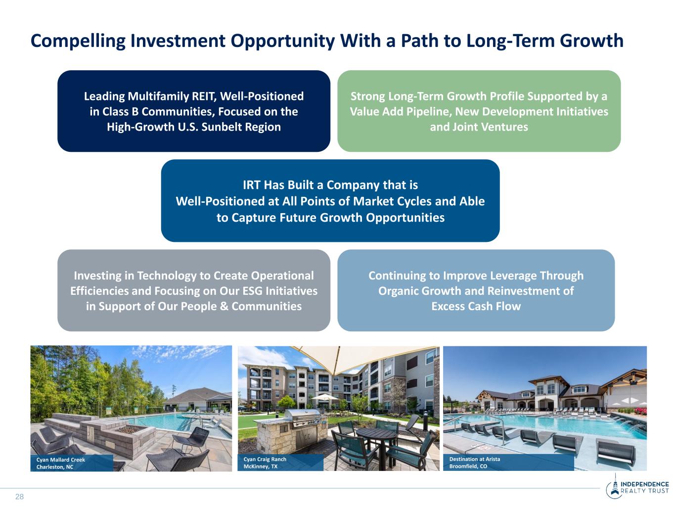 28具有长期增长路径的令人信服的投资机会领先的多户REIT,在B类社区中处于有利地位,专注于高增长的美国阳光地带地区Cyan Mallard Creek Charleston,NC Cyan Craig Ranch McKinney,TX目的地Arista Broomfield,CO投资于技术以创造运营效率,并专注于我们的ESG举措,以支持我们的人民和社区在增值管道支持下的强劲长期增长概况,新的发展举措和合资企业通过有机增长和超额现金流的再投资持续提高杠杆率IRT构建了一家在市场周期的各个时点都有良好定位并能够捕捉未来增长机会的公司