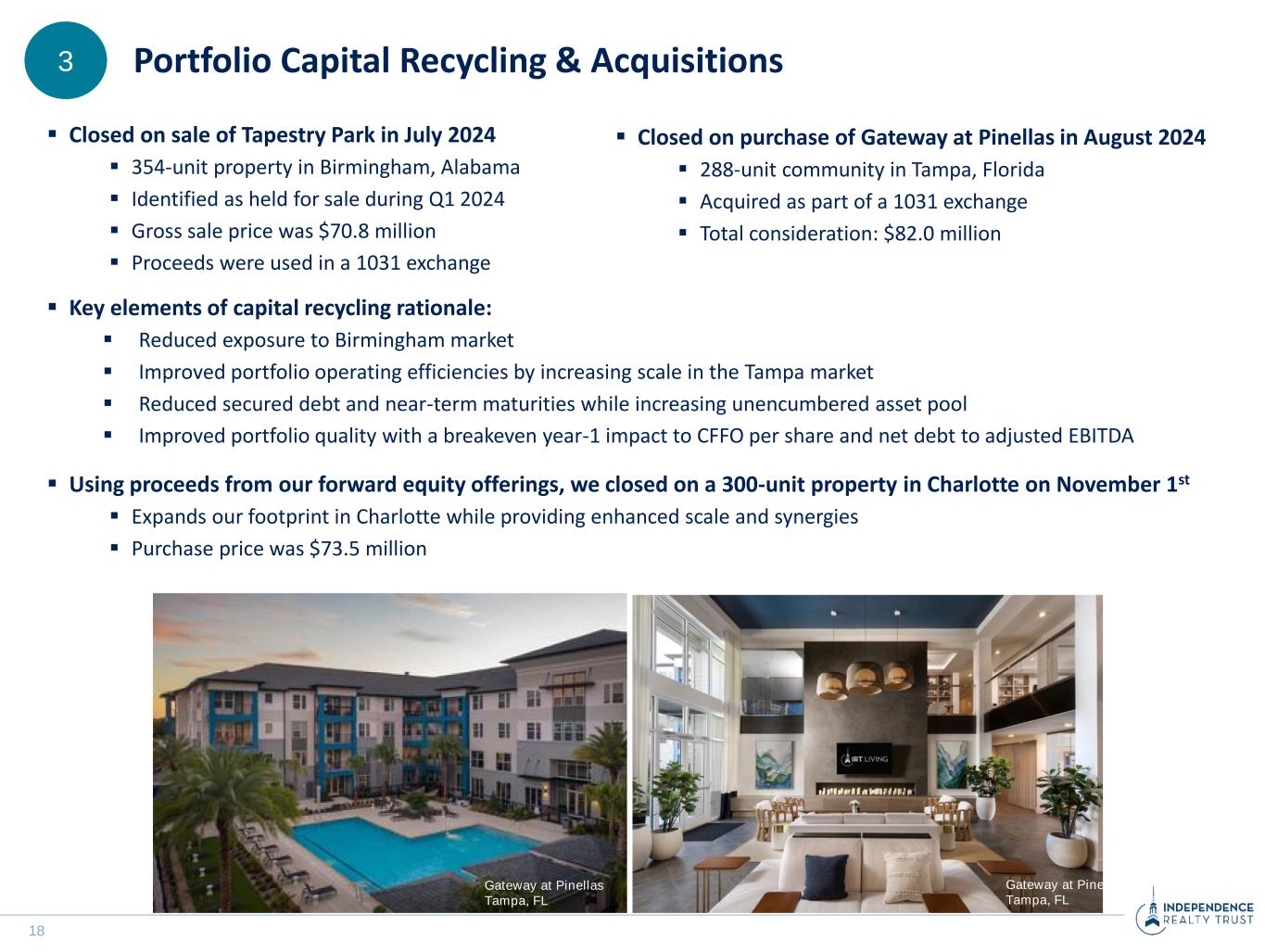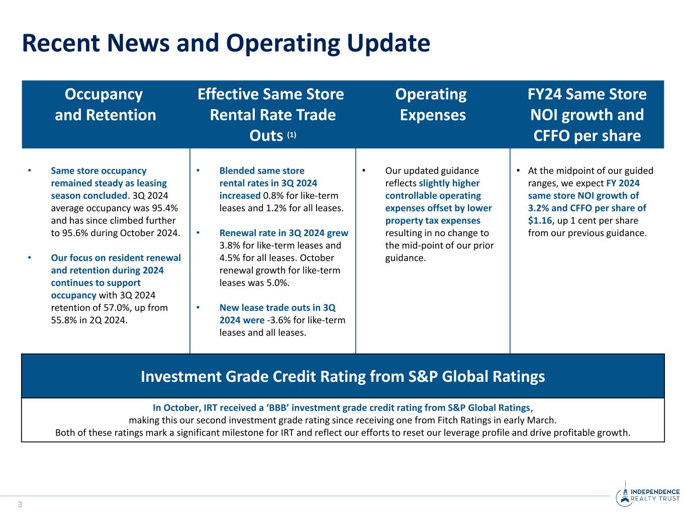 2 IRT概览自有和运营的Sunbelt曝光率74%的NOI 110社区32,670个单位95.4% 3Q24平均入住率+ 90个基点vs 3Q23投资组合摘要(1)同店亮点2024年第三季度(2)•收入增长:同比增长2.5% •居民保留率:57.0%,同比+ 470bps和环比+ 160bps •平均出租率:+ 1.2%至1,566美元• NOI增长:增值同比增长2.2% •迄今为止的项目已产生18.9%的内部成本无杠杆回报率和20.2%的平均租金增长(3)•~14,000个单位可用于增值翻新$ 6.2B的总资产FL GAALTX CO OK in OH KY TN SC NC 2024指导•同店物业收入增长3.1%在我们指导区间的中点,NOI增长3.2%(4)•在我们指导区间的中点,每股核心FFO为1.16美元(4)本演示文稿中的所有符号在第49-50页显示为“结束笔记”。开发中的IRT运营社区社区