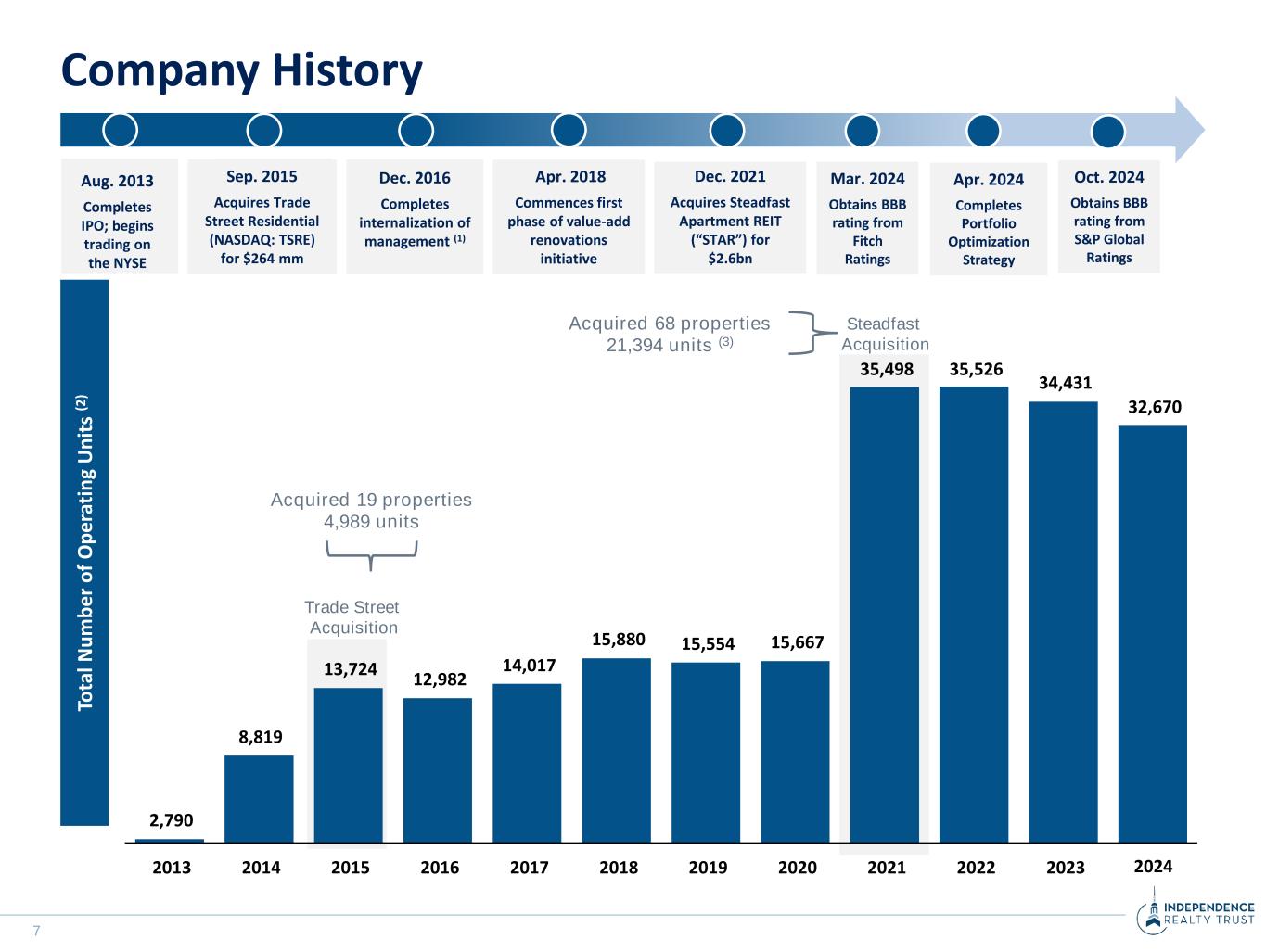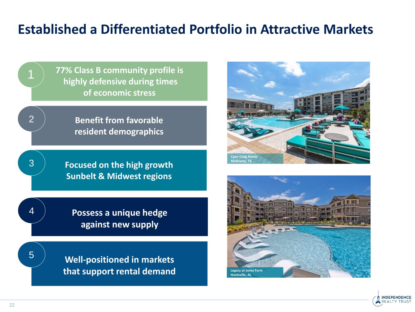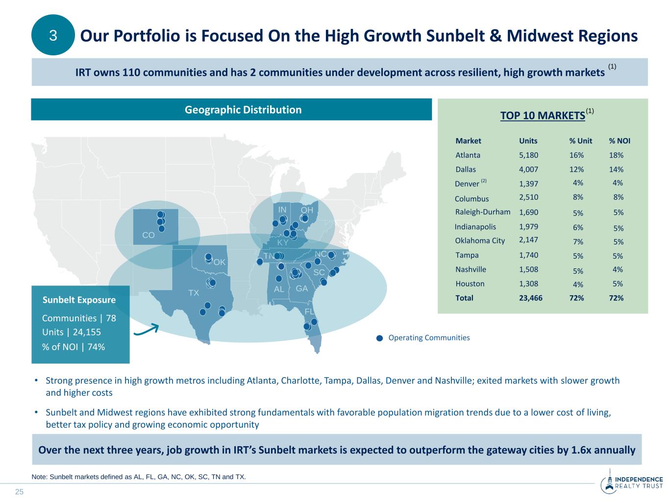 25个排名前10的市场我们的投资组合专注于高增长的Sunbelt和中西部地区投资组合摘要IRT拥有110个社区,并有2个社区正在开发中,跨越有弹性的高增长市场地理分布运营社区•在高增长大都市拥有强大的影响力,包括亚特兰大、夏洛特、坦帕、达拉斯、丹佛和纳什维尔;增长较慢且成本较高的已退出市场•由于生活成本较低,Sunbelt和中西部地区的基本面表现强劲,人口迁移趋势有利,更好的税收政策和不断增长的经济机会社区平均年龄(2)22年130个社区37,828个单位总资产$ 6.2B TBU Desktop FL GALTX CO OK in OH KY TN SC NC Sunbelt曝光社区| 78个单位| NOI的24,155% | 74%(1)市场单位%单位% NOI亚特兰大5,18016% 18%达拉斯4,00712% 14%纳什维尔2,1477% 5%丹佛1,3974% 4% 4% 1,979罗利-达勒姆6% 5%印第安纳波利斯1,6908% 8%哥伦布2,5105% 5%休斯顿1,3084% 5%坦帕1,7405% 5% 5%合计23,46672% 72%注:Sunbelt市场定义为AL、FL、GA、NC,好吧,SC,TN和TX。俄克拉何马城1,5084% 5%(1)3未来三年,预计IRT阳光地带市场的就业增长每年将比门户城市高出1.6倍(2)
