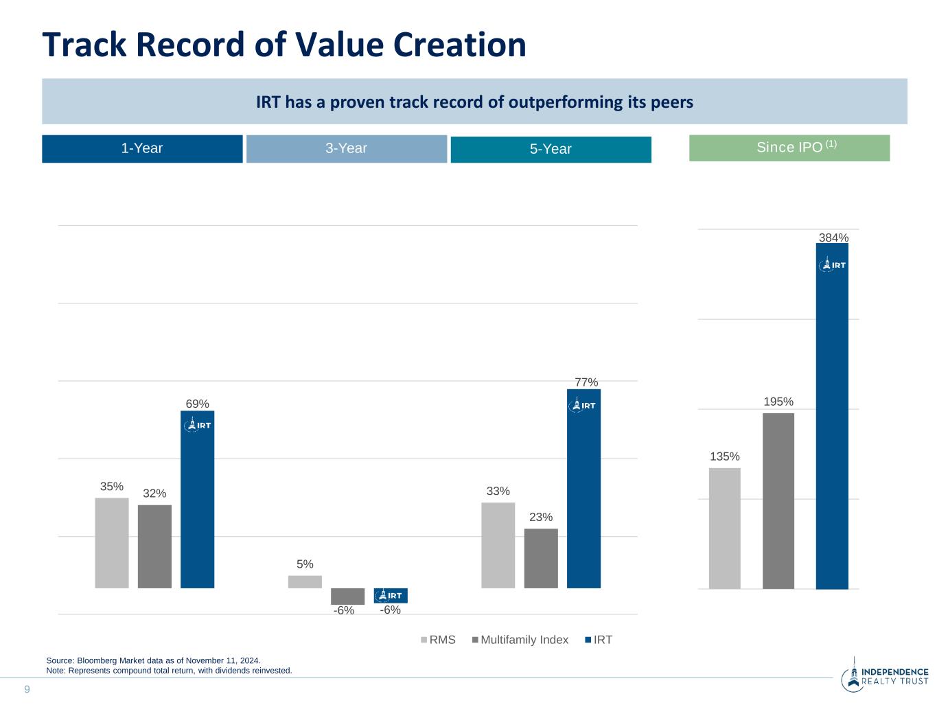8资料来源:公司报告;沿海同业集团包括AVB、EQR、ESS、UDR;非网关同业集团包括CPT、CSR、MAA、NXRT。同店NOI增长和每股CFFO指标基于同行集团公司使用的定义,可能无法进行比较。相对于非门户和沿海市场的同行,IRT正在提供行业领先的经营业绩,IRT在过去几年中超过了行业增长,并且由于我们在阳光地带市场的诱人位置,预计势头将持续下去,以及我们在增值翻新和新发展举措方面的投资同店NOI增长CFFO每股增长IRT Non-Gateway Coastal Peer Group 859095100105110115120125130135140145150201920202021202220232024中点TERM0 Non-Gateway Coastal Peer Group自2019年以来+ 42% IRT Non-Gateway Coastal Peer Group 80859095100105110115120125130135140145150155201920202021202220232024中点TERM0 Non-Gateway Coastal Peer Group自2019年以来+ 53%