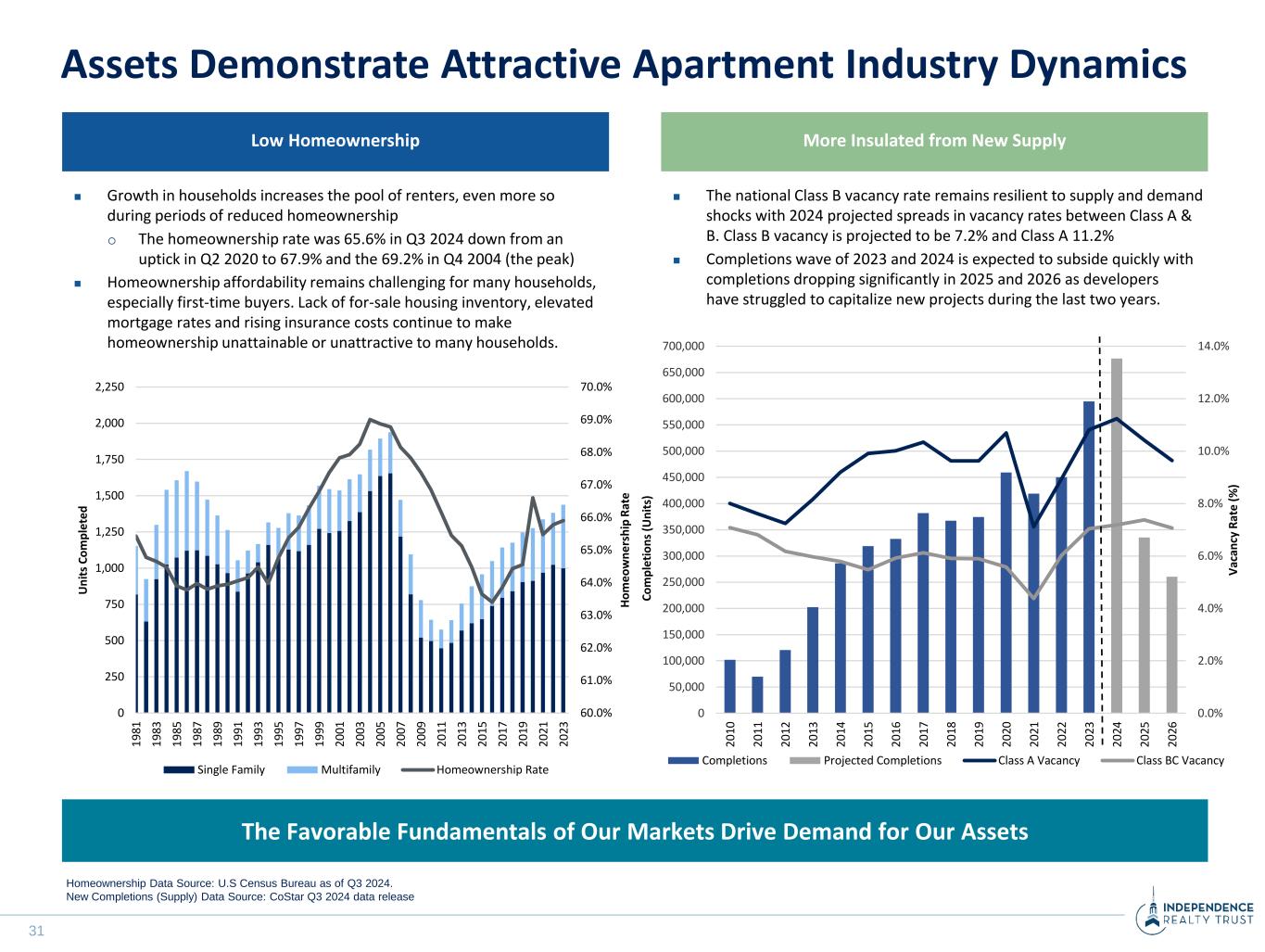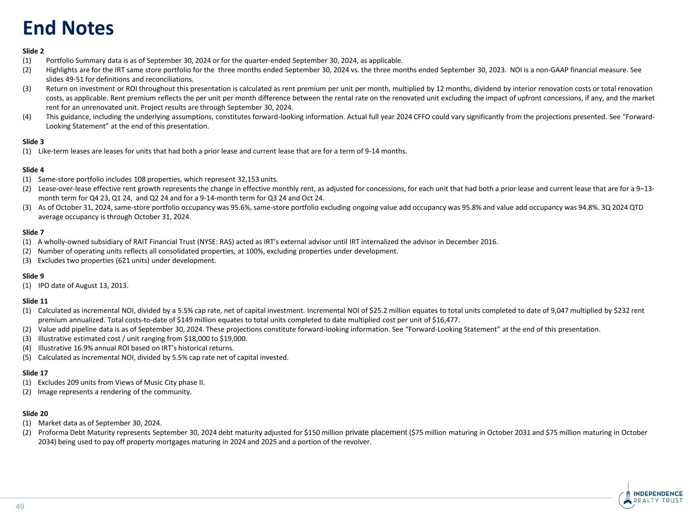 50尾注(续)幻灯片24(1)所有居民人口统计数据均由居民自行报告。平均年龄、平均收入、房租收入比为截至2024年9月30日止三个月内已入住的居民。就业部门数据为截至2024年9月30日的所有居民。幻灯片25(1)截至2024年9月30日的投资组合摘要、2024年第三季度的NOI和截至2024年9月30日的社区总数。(2)包括位于丹佛、柯林斯堡、科罗拉多斯普林斯和科罗拉多州拉夫兰的社区。幻灯片26(1)新交付量占现有库存的百分比来自CoStar 2024年第三季度数据发布,具体针对IRT的子市场。(2)IRT的平均要价vs.两居室新开工郊区租金;反映了Yardi矩阵数据。幻灯片27(1)所有家庭类型(单户家庭、联排别墅和公寓)的实际销售价格来自Redfin 2024年9月的房价中位数。(2)基于NOI敞口为IRT预算-实际情况加权的TOP10 IRT市场。(3)拥有房屋的每月成本使用中位数计算按市场划分的房屋价值是基于IRT的社区所在的邮政编码,PMI来自美国银行抵押贷款计算器,截至2024年11月11日。截至2024年11月11日Bankrate的保险费和房地产税。幻灯片32(1)租金溢价反映管理层根据其惯常的租金设定和评估程序确定的已装修单位的租金(不包括任何前期优惠的影响)与截至呈报日期未装修单位的市场租金之间的每月单位间差异。包括优惠影响的加权平均租金溢价为223美元。(2)单位改造费用包括对内部单元进行改造和进行一定的外部改造的所有费用,包括会所和便利设施。每单位内部成本以租赁单位为基础。每单位外墙费用按小区总单位计算。不包括支持和管理增值计划的间接费用,因为这些费用涉及整个计划,不能分配给单个项目。(3)ROI的计算方法为每月单位租金溢价乘以12,再除以单位内部装修费用或总装修费用(如适用)。ROI-Interior costs using rent premium including the impact of transference including the impact of transference was 18.1%。ROI-Total costs using rent premium including the impact of transference including the impact of transference was 16.2%。(4)我们在物业待改造单元完成85%以上的情况下考虑完成的增值项目。随着租约到期,我们将继续翻新剩余的未装修单元,直到我们完成该物业100%的单元。幻灯片33(1)所有居民人口统计数据均由居民自行报告。截至2024年9月30日的数据。(2)截至2024年9月30日的最近90天数据。