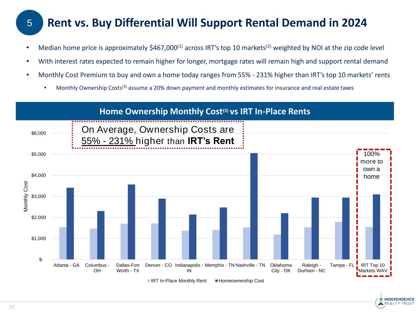 26 $ 0 $ 250 $ 500 $ 750 $ 1,000 $ 1,250 $ 1,500 $ 1,500 $ 1,750 $ 1,750 $ 2,250 $ 2,500 $ 2,750 Atlanta Dallas-Fort Worth Columbus Denver Raleigh-Durham Oklahoma City Indianapolis Tampa Nashville Memphis Total/WAV IRT新建筑3.3% 3.0% 4.8% 5.3% 1.8% 1.6% 2021202220232024E 2025E 2026E新交付量占现有库存的百分比新增供应对IRT的影响不会很大,预计2024年至2026年,IRT市场的新公寓交付量占现有公寓库存的百分比,预计在这3年期间内将会下降IRT的B类社区平均不会与新的A类开发项目产生直接竞争,IRT的租金vs.新建郊区租金每月下降~665美元或42%(2)4~~~(1)租金下降42%