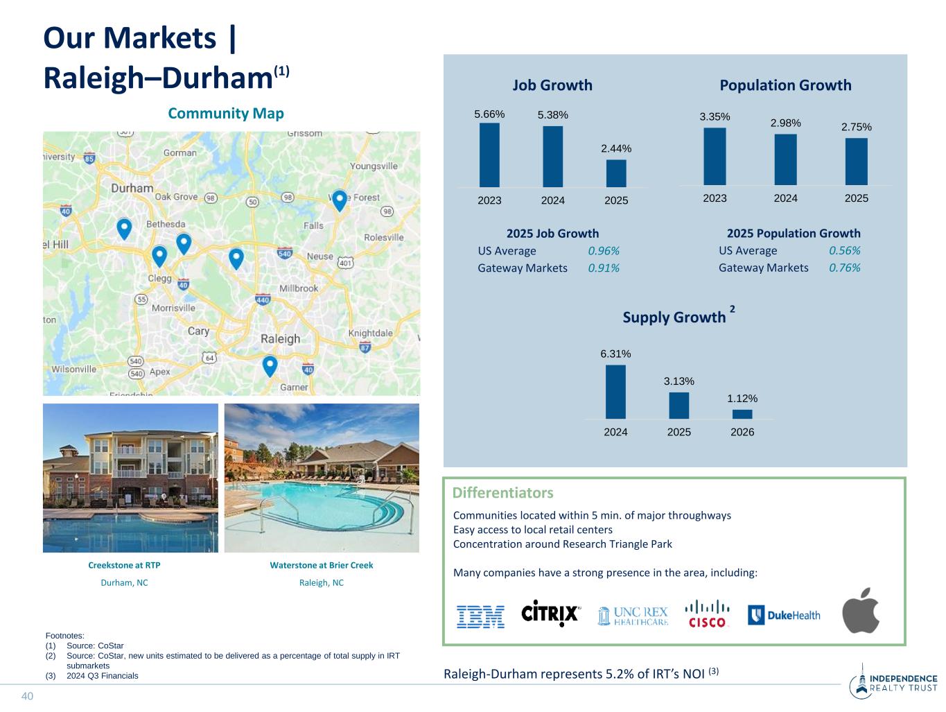 40个社区地图工作增长人口增长供应增长22025年工作增长美国平均0.96%网关市场0.91% 2025年人口增长美国平均0.56%网关市场0.76%差异化社区位于5分钟内。主要通道的距离容易到达当地零售中心集中在三角研究园周围许多公司在该地区拥有强大的影响力,包括:我们的市场| Raleigh – Durham(1)脚注:(1)来源:COStar(2)来源:COStar,预计交付的新单位占IRT子市场总供应量的百分比(3)2024年第三季度财务Raleigh-Durham占RTP Durham的↓ IRT IRT NOI(3)Creekstone的5.2%,NC Waterstone at Brier Creek Raleigh,NC 5.66% 5.38% 2.44% 2023202420253.35% 2.98% 2.75% 2023202420256.31% 3.13% 1.12% 202420252026