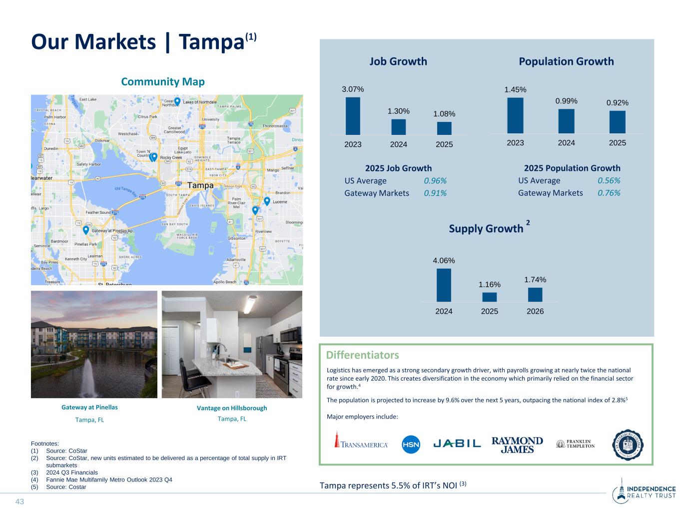 43社区地图就业增长人口增长供应增长22025年就业增长美国平均0.96% Gateway Markets 0.91% 2025人口增长美国平均0.56% Gateway Markets 0.76% Differentiators Our Markets | Tampa(1)脚注:(1)来源:COStar(2)来源:COStar,预计交付的新单位占IRT子市场总供应量的百分比(3)2024年Q3财务(4)房利美多户地铁展望2023年Q4(5)来源:COstar Tampa代表了IRTNOI(3)Gateway at Pinellas Tampa,FL Vantage on Hillsborough Tampa,FL Logistics已成为强劲的二级增长动力,自2020年初以来,就业人数的增长速度几乎是全国的两倍。这在主要依靠金融部门实现增长的经济中创造了多样化。4预计未来5年人口将增长9.6%,超过2.8%的全国指数5主要雇主包括:3.07% 1.30% 1.08% 2023202420251.45% 0.99% 0.92% 2023202420254.06% 1.16% 1.74% 202420252026