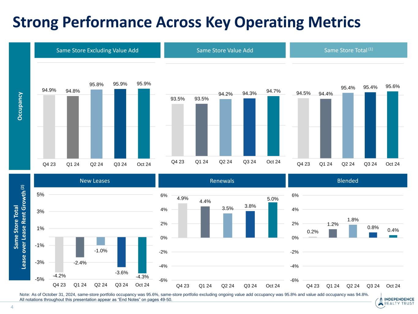 3近期新闻和运营更新入住率和保留率有效同店租金率以旧换新(1)运营费用FY24同店NOI增长和每股CFFO •随着租赁季结束,同店入住率保持稳定。2024年第三季度的平均入住率为95.4%,此后在2024年10月期间进一步攀升至95.6%。•我们在2024年期间对居民续租和保留的关注继续支持入住率,2024年第三季度的保留率为57.0%,高于2024年第二季度的55.8%。• 2024年第三季度混合同店租金同比租赁增长0.8%,所有租赁增长1.2%。• 2024年第三季度同期限租赁的续约率增长3.8%,所有租赁的续约率增长4.5%。10月同期限租赁的续期增长率为5.0%。•同期限租赁和所有租赁在2024年第三季度的新租赁换手为-3.6 %。•我们更新的指引反映出略高的可控运营费用被较低的房产税费用所抵消,导致我们先前指引的中点没有变化。•在我们指引范围的中点,我们预计2024财年同店NOI增长3.2%,每股CFFO为1.16美元,比我们之前的指引每股上涨1美分。投资级信用评级来自标普全球评级在10月份,IRT获得了标普全球评级授予的‘BBB’投资级信用评级,这使其成为我们自3月初获得惠誉评级授予的第二个投资级评级以来的第二个投资级评级。这两个评级都标志着IRT的一个重要里程碑,反映了我们为重置杠杆状况和推动盈利增长所做的努力。
