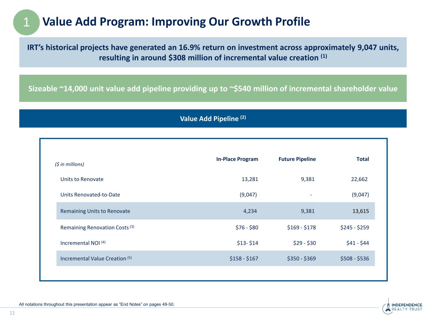 11个就地计划未来管道总单元改造13,2819,3812,662个单元改造至今(9,047)-(9,047)剩余单元改造4,2349,38113,615剩余改造成本(3)$ 76-$ 80 $ 169-$ 178 $ 245-$ 259增量NOI(4)$ 13-$ 14 $ 29-$ 30 $ 41-$ 44增量价值创造(5)$ 158-$ 167 $ 350-$ 369 $ 508-$ 536增值计划:改善我们的增长概况规模~14,000个单位增值管道提供高达~5.4亿美元的增量股东增值管道(2)(百万美元)本演示文稿中的所有符号出现作为第49-50页的“结束笔记”。IRT的历史项目已在约9047个单元中产生了16.9%的投资回报率,从而产生了约3.08亿美元的增量价值创造(1)1