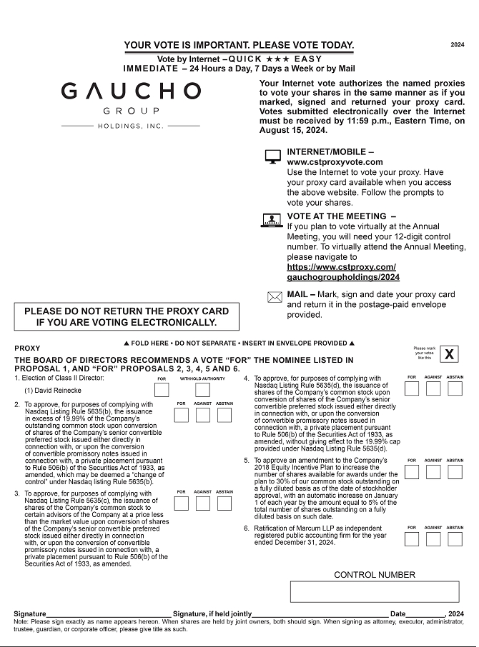 诚邀您于美国东部时间2024年8月16日下午12:00通过网络直播https://www.cstproxy.com/gauchogroupholdings/2024(“年会”),以虚拟方式参加Gaucho Group Holdings, Inc.(“公司”,或“GGH”)的股东年会。在年会上,公司将向股东提交以下六(6)项提案以供批准: