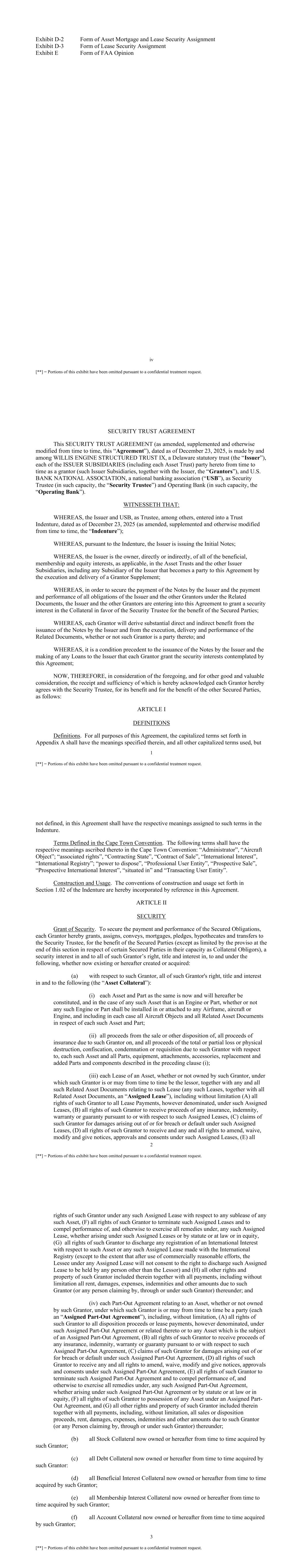 iv [**] = Portions of this exhibit have been omitted pursuant to a confidential treatment request. Exhibit D-2 Form of Asset Mortgage and Lease Security Assignment Exhibit D-3 Form of Lease Security Assignment Exhibit E Form of FAA Opinion 1 [**] = Portions of this exhibit have been omitted pursuant to a confidential treatment request. SECURITY TRUST AGREEMENT This SECURITY TRUST AGREEMENT (as amended, supplemented and otherwise modified from time to time, this “Agreement”), dated as of December 23, 2025, is made by and among WILLIS ENGINE STRUCTURED TRUST IX, a Delaware statutory trust (the “Issuer”), each of the ISSUER SUBSIDIARIES (including each Asset Trust) party hereto from time to time as a grantor (such Issuer Subsidiaries, together with the Issuer, the “Grantors”), and U.S. BANK NATIONAL ASSOCIATION, a national banking association (“USB”), as Security Trustee (in such capacity, the “Security Trustee”) and Operating Bank (in such capacity, the “Operating Bank”). WITNESSETH THAT: WHEREAS, the Issuer and USB, as Trustee, among others, entered into a Trust Indenture, dated as of December 23, 2025 (as amended, supplemented and otherwise modified from time to time, the “Indenture”); WHEREAS, pursuant to the Indenture, the Issuer is issuing the Initial Notes; WHEREAS, the Issuer is the owner, directly or indirectly, of all of the beneficial, membership and equity interests, as applicable, in the Asset Trusts and the other Issuer Subsidiaries, including any Subsidiary of the Issuer that becomes a party to this Agreement by the execution and delivery of a Grantor Supplement; WHEREAS, in order to secure the payment of the Notes by the Issuer and the payment and performance of all obligations of the Issuer and the other Grantors under the Related Documents, the Issuer and the other Grantors are entering into this Agreement to grant a security interest in the Collateral in favor of the Security Trustee for the benefit of the Secured Parties; WHEREAS, each Grantor will derive substantial direct and indirect benefit from the issuance of the Notes by the Issuer and from the execution, delivery and performance of the Related Documents, whether or not such Grantor is a party thereto; and WHEREAS, it is a condition precedent to the issuance of the Notes by the Issuer and the making of any Loans to the Issuer that each Grantor grant the security interests contemplated by this Agreement; NOW, THEREFORE, in consideration of the foregoing, and for other good and valuable consideration, the receipt and sufficiency of which is hereby acknowledged each Grantor hereby agrees with the Security Trustee, for its benefit and for the benefit of the other Secured Parties, as follows: ARTICLE I DEFINITIONS Definitions. For all purposes of this Agreement, the capitalized terms set forth in Appendix A shall have the meanings specified therein, and all other capitalized terms used, but 2 [**] = Portions of this exhibit have been omitted pursuant to a confidential treatment request. not defined, in this Agreement shall have the respective meanings assigned to such terms in the Indenture. Terms Defined in the Cape Town Convention. The following terms shall have the respective meanings ascribed thereto in the Cape Town Convention: “Administrator”, “Aircraft Object”; “associated rights”, “Contracting State”, “Contract of Sale”, “International Interest”, “International Registry”; “power to dispose”, “Professional User Entity”, “Prospective Sale”, “Prospective International Interest”, “situated in” and “Transacting User Entity”. Construction and Usage. The conventions of construction and usage set forth in Section 1.02 of the Indenture are hereby incorporated by reference in this Agreement. ARTICLE II SECURITY Grant of Security. To secure the payment and performance of the Secured Obligations, each Grantor hereby grants, assigns, conveys, mortgages, pledges, hypothecates and transfers to the Security Trustee, for the benefit of the Secured Parties (except as limited by the proviso at the end of this section in respect of certain Secured Parties in their capacity as Collateral Obligors), a security interest in and to all of such Grantor’s right, title and interest in, to and under the following, whether now existing or hereafter created or acquired: (a) with respect to such Grantor, all of such Grantor's right, title and interest in and to the following (the “Asset Collateral”): (i) each Asset and Part as the same is now and will hereafter be constituted, and in the case of any such Asset that is an Engine or Part, whether or not any such Engine or Part shall be installed in or attached to any Airframe, aircraft or Engine, and including in each case all Aircraft Objects and all Related Asset Documents in respect of each such Asset and Part; (ii) all proceeds from the sale or other disposition of, all proceeds of insurance due to such Grantor on, and all proceeds of the total or partial loss or physical destruction, confiscation, condemnation or requisition due to such Grantor with respect to, each such Asset and all Parts, equipment, attachments, accessories, replacement and added Parts and components described in the preceding clause (i); (iii) each Lease of an Asset, whether or not owned by such Grantor, under which such Grantor is or may from time to time be the lessor, together with any and all such Related Asset Documents relating to such Lease (any such Leases, together with all Related Asset Documents, an “Assigned Lease”), including without limitation (A) all rights of such Grantor to all Lease Payments, however denominated, under such Assigned Leases, (B) all rights of such Grantor to receive proceeds of any insurance, indemnity, warranty or guaranty pursuant to or with respect to such Assigned Leases, (C) claims of such Grantor for damages arising out of or for breach or default under such Assigned Leases, (D) all rights o