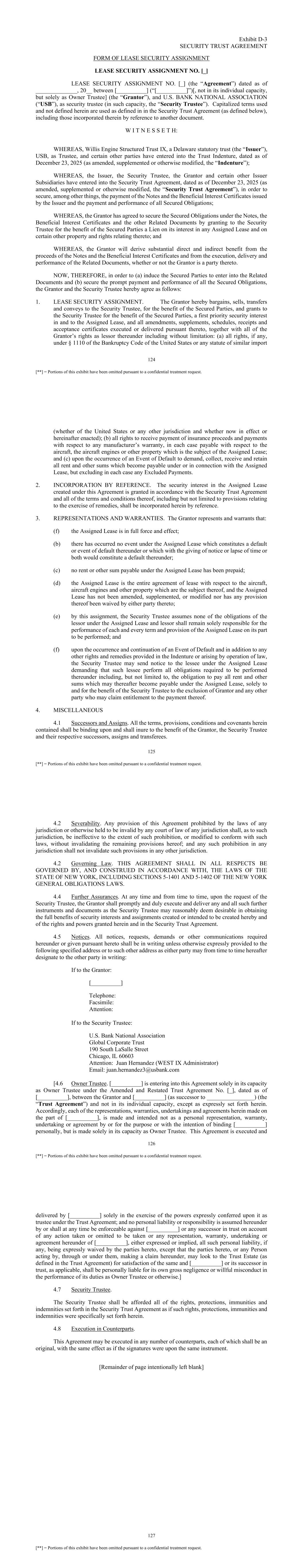 124 [**] = Portions of this exhibit have been omitted pursuant to a confidential treatment request. Exhibit D-3 SECURITY TRUST AGREEMENT FORM OF LEASE SECURITY ASSIGNMENT LEASE SECURITY ASSIGNMENT NO. [_] LEASE SECURITY ASSIGNMENT NO. [_] (the “Agreement”) dated as of ______________, 20__ between [__________] (“[__________]”)[, not in its individual capacity, but solely as Owner Trustee] (the “Grantor”), and U.S. BANK NATIONAL ASSOCIATION (“USB”), as security trustee (in such capacity, the “Security Trustee”). Capitalized terms used and not defined herein are used as defined in in the Security Trust Agreement (as defined below), including those incorporated therein by reference to another document. W I T N E S S E T H: WHEREAS, Willis Engine Structured Trust IX, a Delaware statutory trust (the “Issuer”), USB, as Trustee, and certain other parties have entered into the Trust Indenture, dated as of December 23, 2025 (as amended, supplemented or otherwise modified, the “Indenture”); WHEREAS, the Issuer, the Security Trustee, the Grantor and certain other Issuer Subsidiaries have entered into the Security Trust Agreement, dated as of December 23, 2025 (as amended, supplemented or otherwise modified, the “Security Trust Agreement”), in order to secure, among other things, the payment of the Notes and the Beneficial Interest Certificates issued by the Issuer and the payment and performance of all Secured Obligations; WHEREAS, the Grantor has agreed to secure the Secured Obligations under the Notes, the Beneficial Interest Certificates and the other Related Documents by granting to the Security Trustee for the benefit of the Secured Parties a Lien on its interest in any Assigned Lease and on certain other property and rights relating thereto; and WHEREAS, the Grantor will derive substantial direct and indirect benefit from the proceeds of the Notes and the Beneficial Interest Certificates and from the execution, delivery and performance of the Related Documents, whether or not the Grantor is a party thereto. NOW, THEREFORE, in order to (a) induce the Secured Parties to enter into the Related Documents and (b) secure the prompt payment and performance of all the Secured Obligations, the Grantor and the Security Trustee hereby agree as follows: 1. LEASE SECURITY ASSIGNMENT. The Grantor hereby bargains, sells, transfers and conveys to the Security Trustee, for the benefit of the Secured Parties, and grants to the Security Trustee for the benefit of the Secured Parties, a first priority security interest in and to the Assigned Lease, and all amendments, supplements, schedules, receipts and acceptance certificates executed or delivered pursuant thereto, together with all of the Grantor’s rights as lessor thereunder including without limitation: (a) all rights, if any, under § 1110 of the Bankruptcy Code of the United States or any statute of similar import 125 [**] = Portions of this exhibit have been omitted pursuant to a confidential treatment request. (whether of the United States or any other jurisdiction and whether now in effect or hereinafter enacted); (b) all rights to receive payment of insurance proceeds and payments with respect to any manufacturer’s warranty, in each case payable with respect to the aircraft, the aircraft engines or other property which is the subject of the Assigned Lease; and (c) upon the occurrence of an Event of Default to demand, collect, receive and retain all rent and other sums which become payable under or in connection with the Assigned Lease, but excluding in each case any Excluded Payments. 2. INCORPORATION BY REFERENCE. The security interest in the Assigned Lease created under this Agreement is granted in accordance with the Security Trust Agreement and all of the terms and conditions thereof, including but not limited to provisions relating to the exercise of remedies, shall be incorporated herein by reference. 3. REPRESENTATIONS AND WARRANTIES. The Grantor represents and warrants that: (f) the Assigned Lease is in full force and effect; (b) there has occurred no event under the Assigned Lease which constitutes a default or event of default thereunder or which with the giving of notice or lapse of time or both would constitute a default thereunder; (c) no rent or other sum payable under the Assigned Lease has been prepaid; (d) the Assigned Lease is the entire agreement of lease with respect to the aircraft, aircraft engines and other property which are the subject thereof, and the Assigned Lease has not been amended, supplemented, or modified nor has any provision thereof been waived by either party thereto; (e) by this assignment, the Security Trustee assumes none of the obligations of the lessor under the Assigned Lease and lessor shall remain solely responsible for the performance of each and every term and provision of the Assigned Lease on its part to be performed; and (f) upon the occurrence and continuation of an Event of Default and in addition to any other rights and remedies provided in the Indenture or arising by operation of law, the Security Trustee may send notice to the lessee under the Assigned Lease demanding that such lessee perform all obligations required to be performed thereunder including, but not limited to, the obligation to pay all rent and other sums which may thereafter become payable under the Assigned Lease, solely to and for the benefit of the Security Trustee to the exclusion of Grantor and any other party who may claim entitlement to the payment thereof. 4. MISCELLANEOUS 4.1 Successors and Assigns. All the terms, provisions, conditions and covenants herein contained shall be binding upon and shall inure to the benefit of the Grantor, the Security Trustee and their respective successors, assigns and transferees. 126 [**] = Portions of this exhibit have been omitted pursuant to a confidential treatment request. 4.2 Severability. Any provision of this Agreement prohibited by the laws of any 