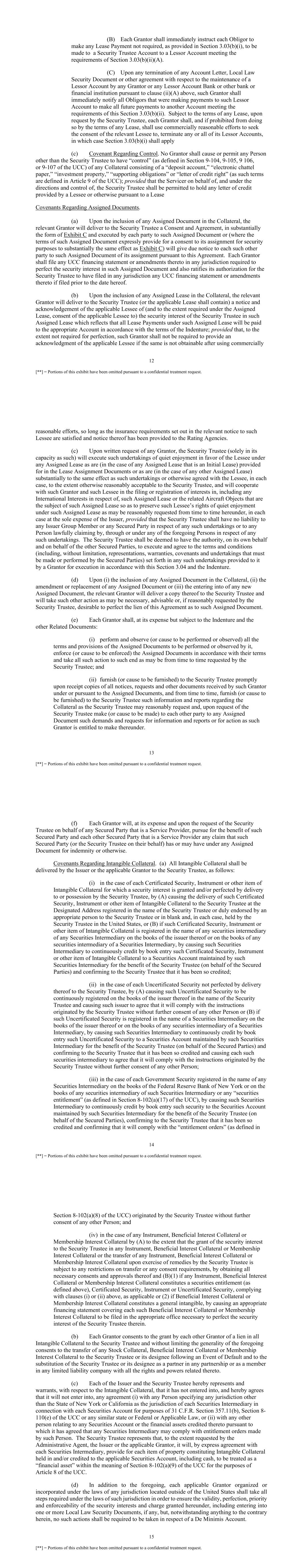12 [**] = Portions of this exhibit have been omitted pursuant to a confidential treatment request. (B) Each Grantor shall immediately instruct each Obligor to make any Lease Payment not required, as provided in Section 3.03(b)(i), to be made to a Security Trustee Account to a Lessor Account meeting the requirements of Section 3.03(b)(ii)(A). (C) Upon any termination of any Account Letter, Local Law Security Document or other agreement with respect to the maintenance of a Lessor Account by any Grantor or any Lessor Account Bank or other bank or financial institution pursuant to clause (ii)(A) above, such Grantor shall immediately notify all Obligors that were making payments to such Lessor Account to make all future payments to another Account meeting the requirements of this Section 3.03(b)(ii). Subject to the terms of any Lease, upon request by the Security Trustee, each Grantor shall, and if prohibited from doing so by the terms of any Lease, shall use commercially reasonable efforts to seek the consent of the relevant Lessee to, terminate any or all of its Lessor Accounts, in which case Section 3.03(b)(i) shall apply (c) Covenant Regarding Control. No Grantor shall cause or permit any Person other than the Security Trustee to have “control” (as defined in Section 9-104, 9-105, 9 106, or 9-107 of the UCC) of any Collateral consisting of a “deposit account,” “electronic chattel paper,” “investment property,” “supporting obligations” or “letter of credit right” (as such terms are defined in Article 9 of the UCC); provided that the Servicer on behalf of, and under the directions and control of, the Security Trustee shall be permitted to hold any letter of credit provided by a Lessee or otherwise pursuant to a Lease Covenants Regarding Assigned Documents. (a) Upon the inclusion of any Assigned Document in the Collateral, the relevant Grantor will deliver to the Security Trustee a Consent and Agreement, in substantially the form of Exhibit C and executed by each party to such Assigned Document or (where the terms of such Assigned Document expressly provide for a consent to its assignment for security purposes to substantially the same effect as Exhibit C) will give due notice to each such other party to such Assigned Document of its assignment pursuant to this Agreement. Each Grantor shall file any UCC financing statement or amendments thereto in any jurisdiction required to perfect the security interest in such Assigned Document and also ratifies its authorization for the Security Trustee to have filed in any jurisdiction any UCC financing statement or amendments thereto if filed prior to the date hereof. (b) Upon the inclusion of any Assigned Lease in the Collateral, the relevant Grantor will deliver to the Security Trustee (or the applicable Lease shall contain) a notice and acknowledgement of the applicable Lessee of (and to the extent required under the Assigned Lease, consent of the applicable Lessee to) the security interest of the Security Trustee in such Assigned Lease which reflects that all Lease Payments under such Assigned Lease will be paid to the appropriate Account in accordance with the terms of the Indenture; provided that, to the extent not required for perfection, such Grantor shall not be required to provide an acknowledgment of the applicable Lessee if the same is not obtainable after using commercially 13 [**] = Portions of this exhibit have been omitted pursuant to a confidential treatment request. reasonable efforts, so long as the insurance requirements set out in the relevant notice to such Lessee are satisfied and notice thereof has been provided to the Rating Agencies. (c) Upon written request of any Grantor, the Security Trustee (solely in its capacity as such) will execute such undertakings of quiet enjoyment in favor of the Lessee under any Assigned Lease as are (in the case of any Assigned Lease that is an Initial Lease) provided for in the Lease Assignment Documents or as are (in the case of any other Assigned Lease) substantially to the same effect as such undertakings or otherwise agreed with the Lessee, in each case, to the extent otherwise reasonably acceptable to the Security Trustee, and will cooperate with such Grantor and such Lessee in the filing or registration of interests in, including any International Interests in respect of, such Assigned Lease or the related Aircraft Objects that are the subject of such Assigned Lease so as to preserve such Lessee’s rights of quiet enjoyment under such Assigned Lease as may be reasonably requested from time to time hereunder, in each case at the sole expense of the Issuer, provided that the Security Trustee shall have no liability to any Issuer Group Member or any Secured Party in respect of any such undertakings or to any Person lawfully claiming by, through or under any of the foregoing Persons in respect of any such undertakings. The Security Trustee shall be deemed to have the authority, on its own behalf and on behalf of the other Secured Parties, to execute and agree to the terms and conditions (including, without limitation, representations, warranties, covenants and undertakings that must be made or performed by the Secured Parties) set forth in any such undertakings provided to it by a Grantor for execution in accordance with this Section 3.04 and the Indenture. (d) Upon (i) the inclusion of any Assigned Document in the Collateral, (ii) the amendment or replacement of any Assigned Document or (iii) the entering into of any new Assigned Document, the relevant Grantor will deliver a copy thereof to the Security Trustee and will take such other action as may be necessary, advisable or, if reasonably requested by the Security Trustee, desirable to perfect the lien of this Agreement as to such Assigned Document. (e) Each Grantor shall, at its expense but subject to the Indenture and the other Related Documents: (i) perform and observe (or cause to be performed or observed) all t