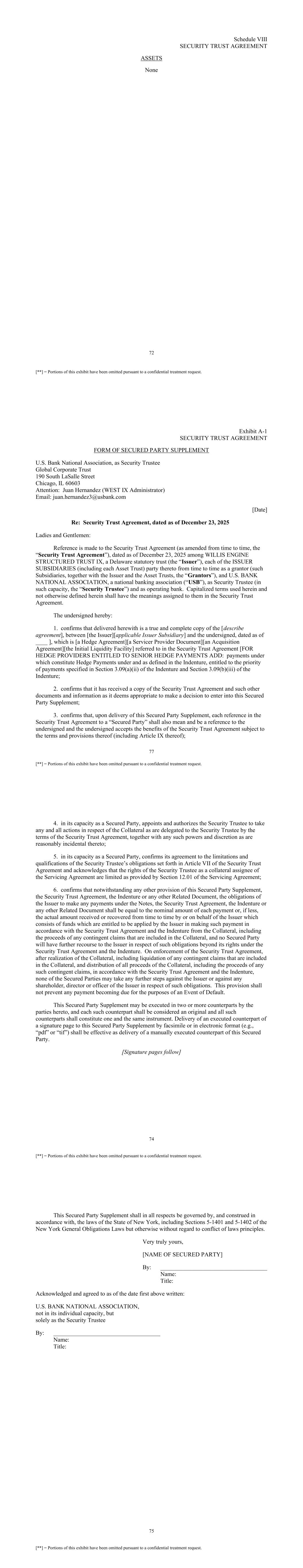 72 [**] = Portions of this exhibit have been omitted pursuant to a confidential treatment request. Schedule VIII SECURITY TRUST AGREEMENT ASSETS None 77 [**] = Portions of this exhibit have been omitted pursuant to a confidential treatment request. Exhibit A-1 SECURITY TRUST AGREEMENT FORM OF SECURED PARTY SUPPLEMENT U.S. Bank National Association, as Security Trustee Global Corporate Trust 190 South LaSalle Street Chicago, IL 60603 Attention: Juan Hernandez (WEST IX Administrator) Email: juan.hernandez3@usbank.com [Date] Re: Security Trust Agreement, dated as of December 23, 2025 Ladies and Gentlemen: Reference is made to the Security Trust Agreement (as amended from time to time, the “Security Trust Agreement”), dated as of December 23, 2025 among WILLIS ENGINE STRUCTURED TRUST IX, a Delaware statutory trust (the “Issuer”), each of the ISSUER SUBSIDIARIES (including each Asset Trust) party thereto from time to time as a grantor (such Subsidiaries, together with the Issuer and the Asset Trusts, the “Grantors”), and U.S. BANK NATIONAL ASSOCIATION, a national banking association (“USB”), as Security Trustee (in such capacity, the “Security Trustee”) and as operating bank. Capitalized terms used herein and not otherwise defined herein shall have the meanings assigned to them in the Security Trust Agreement. The undersigned hereby: 1. confirms that delivered herewith is a true and complete copy of the [describe agreement], between [the Issuer][applicable Issuer Subsidiary] and the undersigned, dated as of ____ ], which is [a Hedge Agreement][a Servicer Provider Document][an Acquisition Agreement][the Initial Liquidity Facility] referred to in the Security Trust Agreement [FOR HEDGE PROVIDERS ENTITLED TO SENIOR HEDGE PAYMENTS ADD: payments under which constitute Hedge Payments under and as defined in the Indenture, entitled to the priority of payments specified in Section 3.09(a)(ii) of the Indenture and Section 3.09(b)(iii) of the Indenture; 2. confirms that it has received a copy of the Security Trust Agreement and such other documents and information as it deems appropriate to make a decision to enter into this Secured Party Supplement; 3. confirms that, upon delivery of this Secured Party Supplement, each reference in the Security Trust Agreement to a “Secured Party” shall also mean and be a reference to the undersigned and the undersigned accepts the benefits of the Security Trust Agreement subject to the terms and provisions thereof (including Article IX thereof); 74 [**] = Portions of this exhibit have been omitted pursuant to a confidential treatment request. 4. in its capacity as a Secured Party, appoints and authorizes the Security Trustee to take any and all actions in respect of the Collateral as are delegated to the Security Trustee by the terms of the Security Trust Agreement, together with any such powers and discretion as are reasonably incidental thereto; 5. in its capacity as a Secured Party, confirms its agreement to the limitations and qualifications of the Security Trustee’s obligations set forth in Article VII of the Security Trust Agreement and acknowledges that the rights of the Security Trustee as a collateral assignee of the Servicing Agreement are limited as provided by Section 12.01 of the Servicing Agreement; 6. confirms that notwithstanding any other provision of this Secured Party Supplement, the Security Trust Agreement, the Indenture or any other Related Document, the obligations of the Issuer to make any payments under the Notes, the Security Trust Agreement, the Indenture or any other Related Document shall be equal to the nominal amount of each payment or, if less, the actual amount received or recovered from time to time by or on behalf of the Issuer which consists of funds which are entitled to be applied by the Issuer in making such payment in accordance with the Security Trust Agreement and the Indenture from the Collateral, including the proceeds of any contingent claims that are included in the Collateral, and no Secured Party will have further recourse to the Issuer in respect of such obligations beyond its rights under the Security Trust Agreement and the Indenture. On enforcement of the Security Trust Agreement, after realization of the Collateral, including liquidation of any contingent claims that are included in the Collateral, and distribution of all proceeds of the Collateral, including the proceeds of any such contingent claims, in accordance with the Security Trust Agreement and the Indenture, none of the Secured Parties may take any further steps against the Issuer or against any shareholder, director or officer of the Issuer in respect of such obligations. This provision shall not prevent any payment becoming due for the purposes of an Event of Default. This Secured Party Supplement may be executed in two or more counterparts by the parties hereto, and each such counterpart shall be considered an original and all such counterparts shall constitute one and the same instrument. Delivery of an executed counterpart of a signature page to this Secured Party Supplement by facsimile or in electronic format (e.g., “pdf” or “tif”) shall be effective as delivery of a manually executed counterpart of this Secured Party. [Signature pages follow] 75 [**] = Portions of this exhibit have been omitted pursuant to a confidential treatment request. This Secured Party Supplement shall in all respects be governed by, and construed in accordance with, the laws of the State of New York, including Sections 5-1401 and 5-1402 of the New York General Obligations Laws but otherwise without regard to conflict of laws principles. Very truly yours, [NAME OF SECURED PARTY] By: ____________________________________ Name: Title: Acknowledged and agreed to as of the date first above written: U.S. BANK NATIONAL ASSOCIATION, not in its individual capacity, but solely as the Security Trustee By: ____________________________________ Name: Titl
