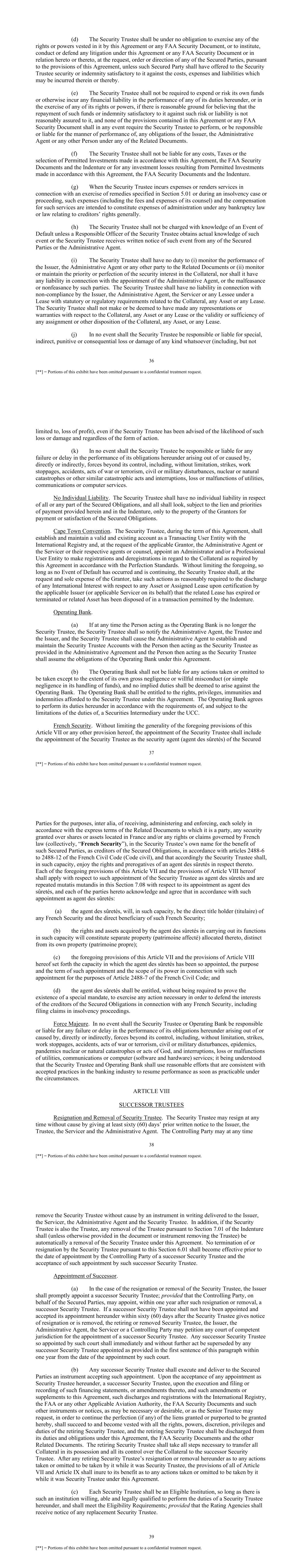 36 [**] = Portions of this exhibit have been omitted pursuant to a confidential treatment request. (d) The Security Trustee shall be under no obligation to exercise any of the rights or powers vested in it by this Agreement or any FAA Security Document, or to institute, conduct or defend any litigation under this Agreement or any FAA Security Document or in relation hereto or thereto, at the request, order or direction of any of the Secured Parties, pursuant to the provisions of this Agreement, unless such Secured Party shall have offered to the Security Trustee security or indemnity satisfactory to it against the costs, expenses and liabilities which may be incurred therein or thereby. (e) The Security Trustee shall not be required to expend or risk its own funds or otherwise incur any financial liability in the performance of any of its duties hereunder, or in the exercise of any of its rights or powers, if there is reasonable ground for believing that the repayment of such funds or indemnity satisfactory to it against such risk or liability is not reasonably assured to it, and none of the provisions contained in this Agreement or any FAA Security Document shall in any event require the Security Trustee to perform, or be responsible or liable for the manner of performance of, any obligations of the Issuer, the Administrative Agent or any other Person under any of the Related Documents. (f) The Security Trustee shall not be liable for any costs, Taxes or the selection of Permitted Investments made in accordance with this Agreement, the FAA Security Documents and the Indenture or for any investment losses resulting from Permitted Investments made in accordance with this Agreement, the FAA Security Documents and the Indenture. (g) When the Security Trustee incurs expenses or renders services in connection with an exercise of remedies specified in Section 5.01 or during an insolvency case or proceeding, such expenses (including the fees and expenses of its counsel) and the compensation for such services are intended to constitute expenses of administration under any bankruptcy law or law relating to creditors’ rights generally. (h) The Security Trustee shall not be charged with knowledge of an Event of Default unless a Responsible Officer of the Security Trustee obtains actual knowledge of such event or the Security Trustee receives written notice of such event from any of the Secured Parties or the Administrative Agent. (i) The Security Trustee shall have no duty to (i) monitor the performance of the Issuer, the Administrative Agent or any other party to the Related Documents or (ii) monitor or maintain the priority or perfection of the security interest in the Collateral, nor shall it have any liability in connection with the appointment of the Administrative Agent, or the malfeasance or nonfeasance by such parties. The Security Trustee shall have no liability in connection with non-compliance by the Issuer, the Administrative Agent, the Servicer or any Lessee under a Lease with statutory or regulatory requirements related to the Collateral, any Asset or any Lease. The Security Trustee shall not make or be deemed to have made any representations or warranties with respect to the Collateral, any Asset or any Lease or the validity or sufficiency of any assignment or other disposition of the Collateral, any Asset, or any Lease. (j) In no event shall the Security Trustee be responsible or liable for special, indirect, punitive or consequential loss or damage of any kind whatsoever (including, but not 37 [**] = Portions of this exhibit have been omitted pursuant to a confidential treatment request. limited to, loss of profit), even if the Security Trustee has been advised of the likelihood of such loss or damage and regardless of the form of action. (k) In no event shall the Security Trustee be responsible or liable for any failure or delay in the performance of its obligations hereunder arising out of or caused by, directly or indirectly, forces beyond its control, including, without limitation, strikes, work stoppages, accidents, acts of war or terrorism, civil or military disturbances, nuclear or natural catastrophes or other similar catastrophic acts and interruptions, loss or malfunctions of utilities, communications or computer services. No Individual Liability. The Security Trustee shall have no individual liability in respect of all or any part of the Secured Obligations, and all shall look, subject to the lien and priorities of payment provided herein and in the Indenture, only to the property of the Grantors for payment or satisfaction of the Secured Obligations. Cape Town Convention. The Security Trustee, during the term of this Agreement, shall establish and maintain a valid and existing account as a Transacting User Entity with the International Registry and, at the request of the applicable Grantor, the Administrative Agent or the Servicer or their respective agents or counsel, appoint an Administrator and/or a Professional User Entity to make registrations and deregistrations in regard to the Collateral as required by this Agreement in accordance with the Perfection Standards. Without limiting the foregoing, so long as no Event of Default has occurred and is continuing, the Security Trustee shall, at the request and sole expense of the Grantor, take such actions as reasonably required to the discharge of any International Interest with respect to any Asset or Assigned Lease upon certification by the applicable Issuer (or applicable Servicer on its behalf) that the related Lease has expired or terminated or related Asset has been disposed of in a transaction permitted by the Indenture. Operating Bank. (a) If at any time the Person acting as the Operating Bank is no longer the Security Trustee, the Security Trustee shall so notify the Administrative Agent, the Trustee and the Issuer, and the Security Trustee shall cause the Administrative Agent to establish and maintain the Sec